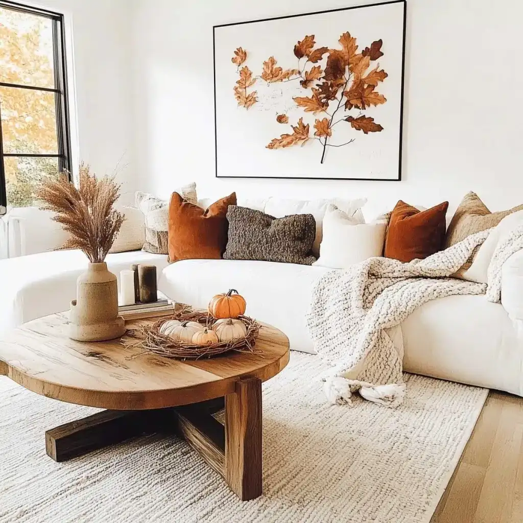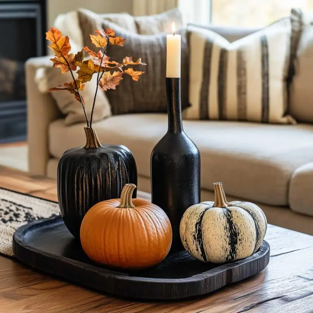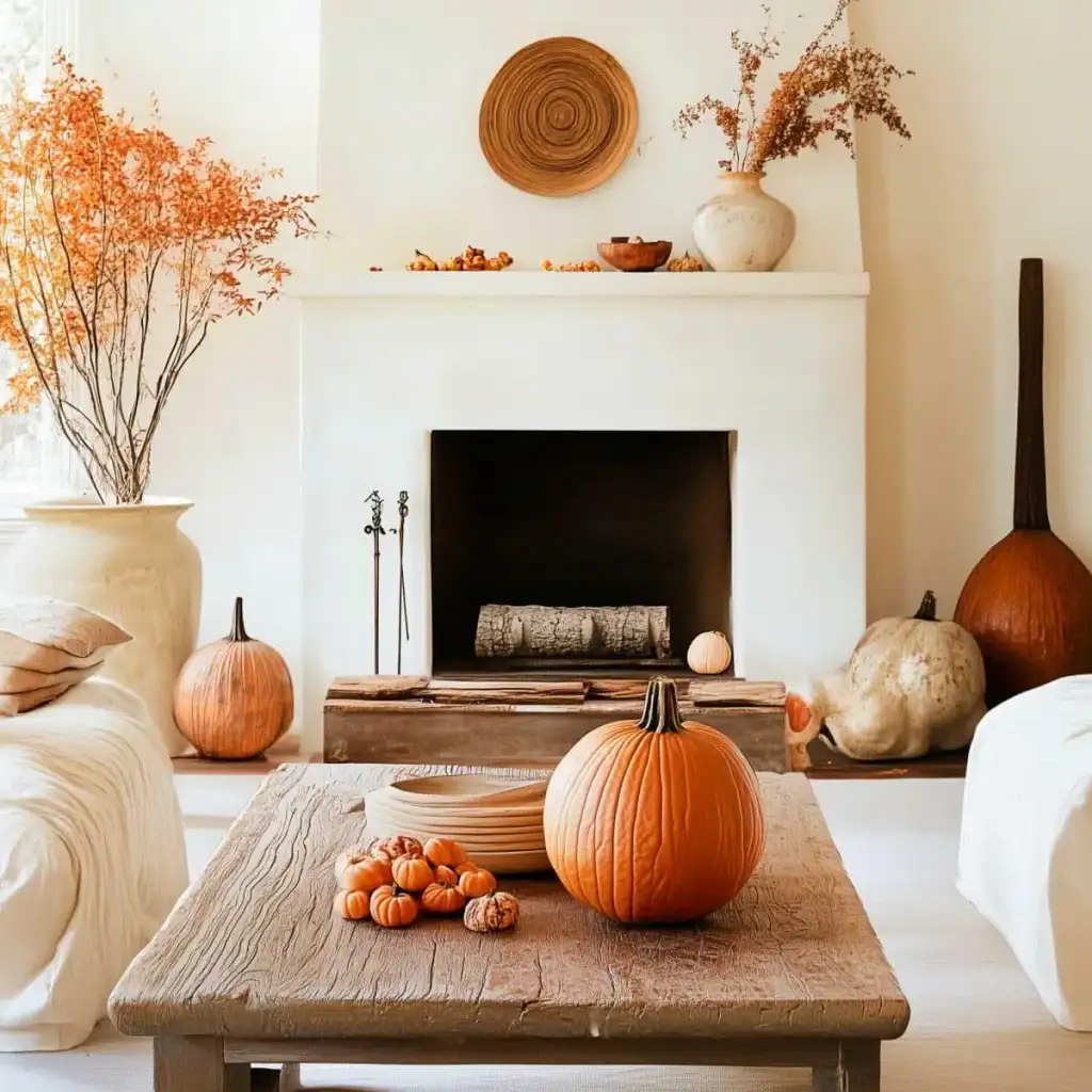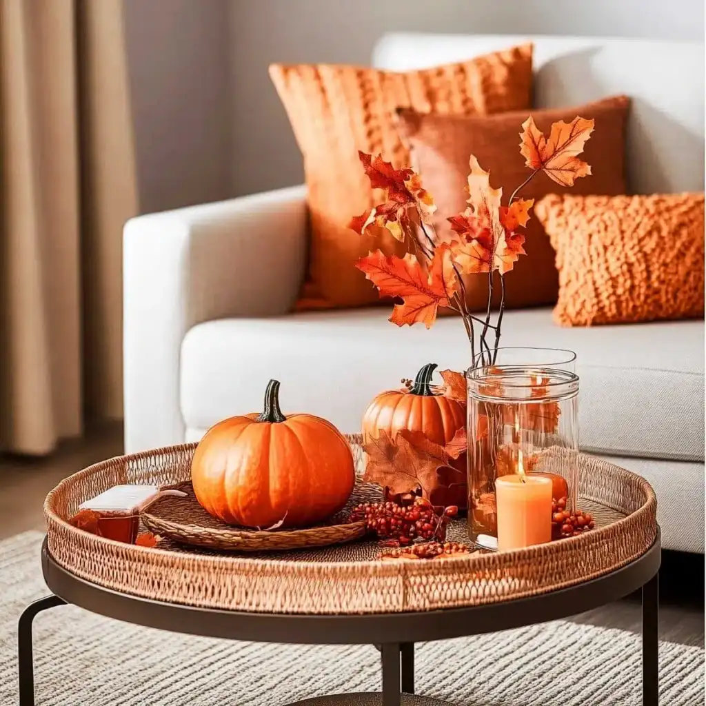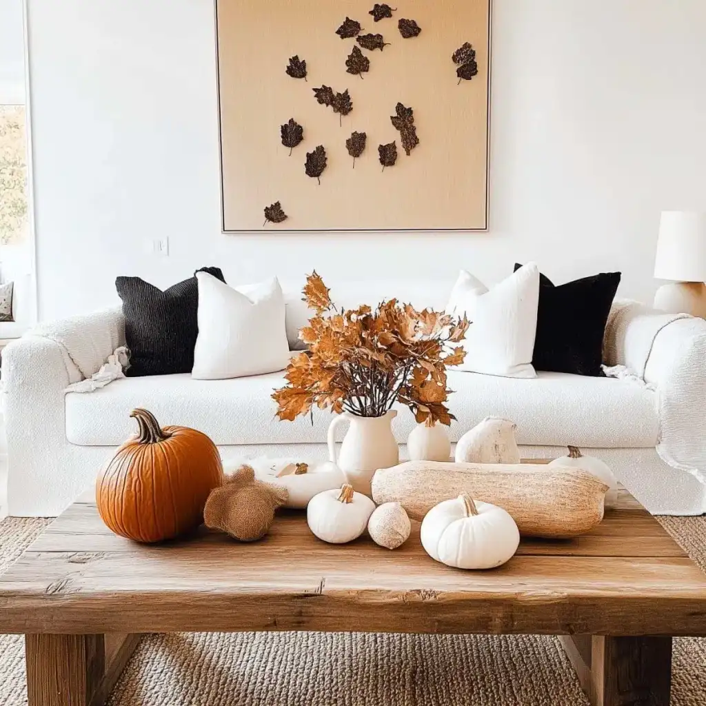 Κράτησε καθαρή αισθητική με 2 ή 3 εστίες ενδιαφέροντος σε κάθε χώρο. Η υπερφόρτωση κουράζει και μειώνει την αίσθηση ποιότητας. Εστίασε σε ένα τραπεζάκι σαλονιού, το ράφι του τζακιού, τον μπουφέ της τραπεζαρίας ή το τραπέζι της βεράντας. Χρησιμοποίησε κολοκύθες σε δίσκο με κεριά, κλαδιά με φύλλα σε λευκό βάζο και έναν πίνακα με φθινοπωρινό τοπίο ως ήσυχο φόντο.