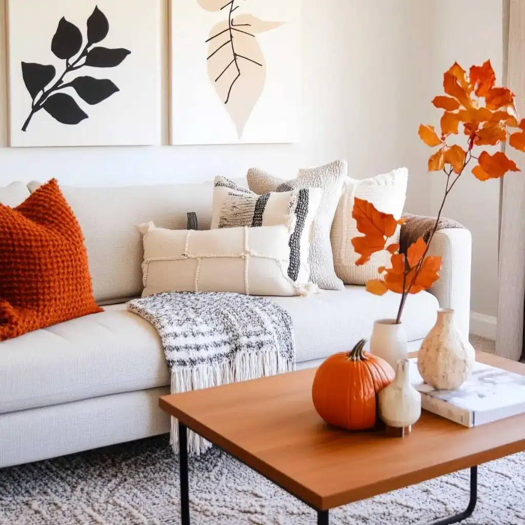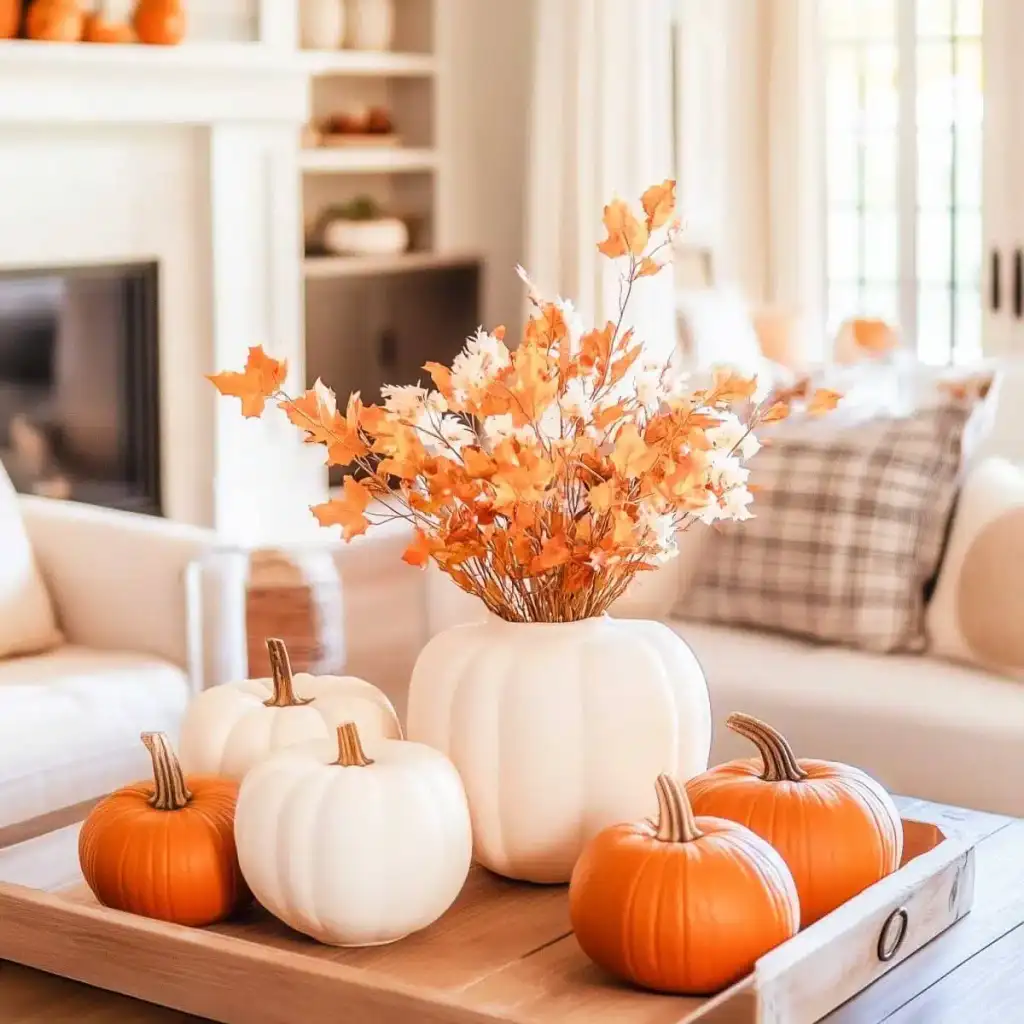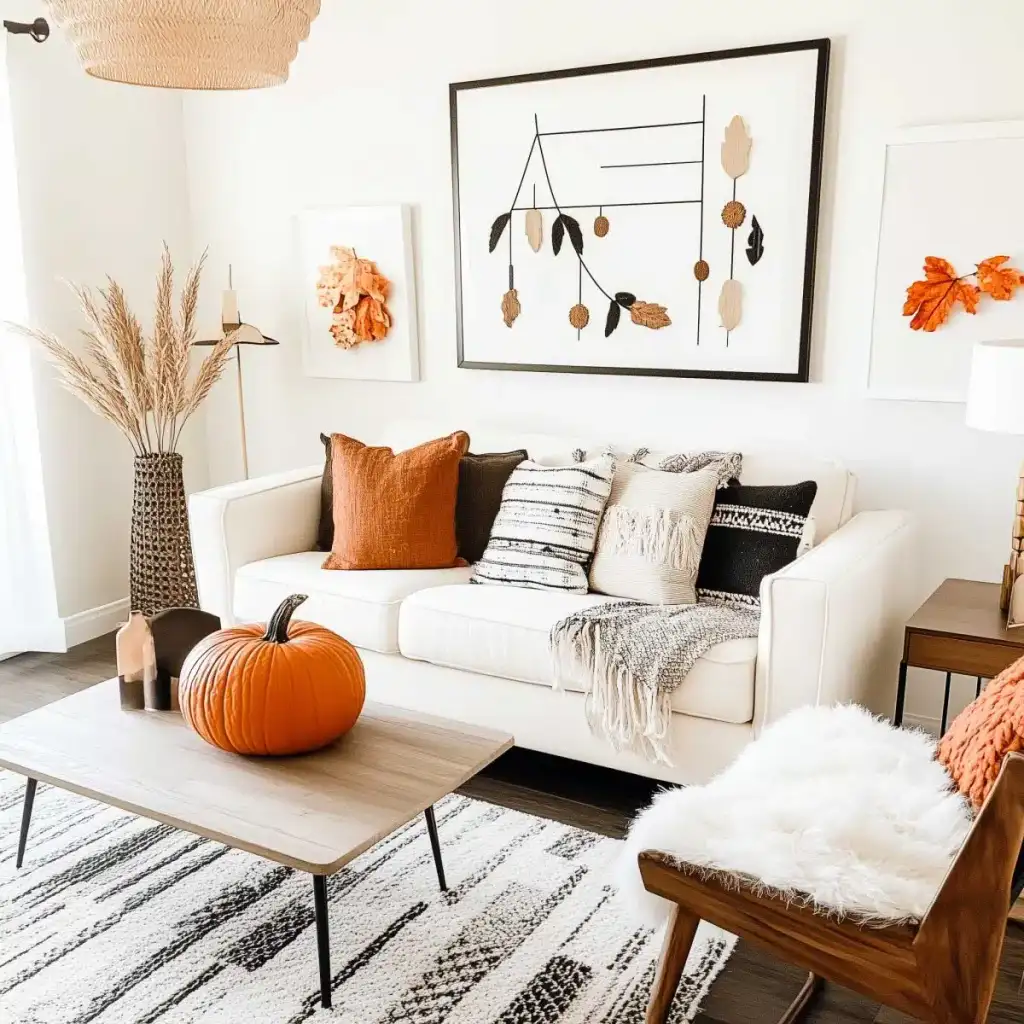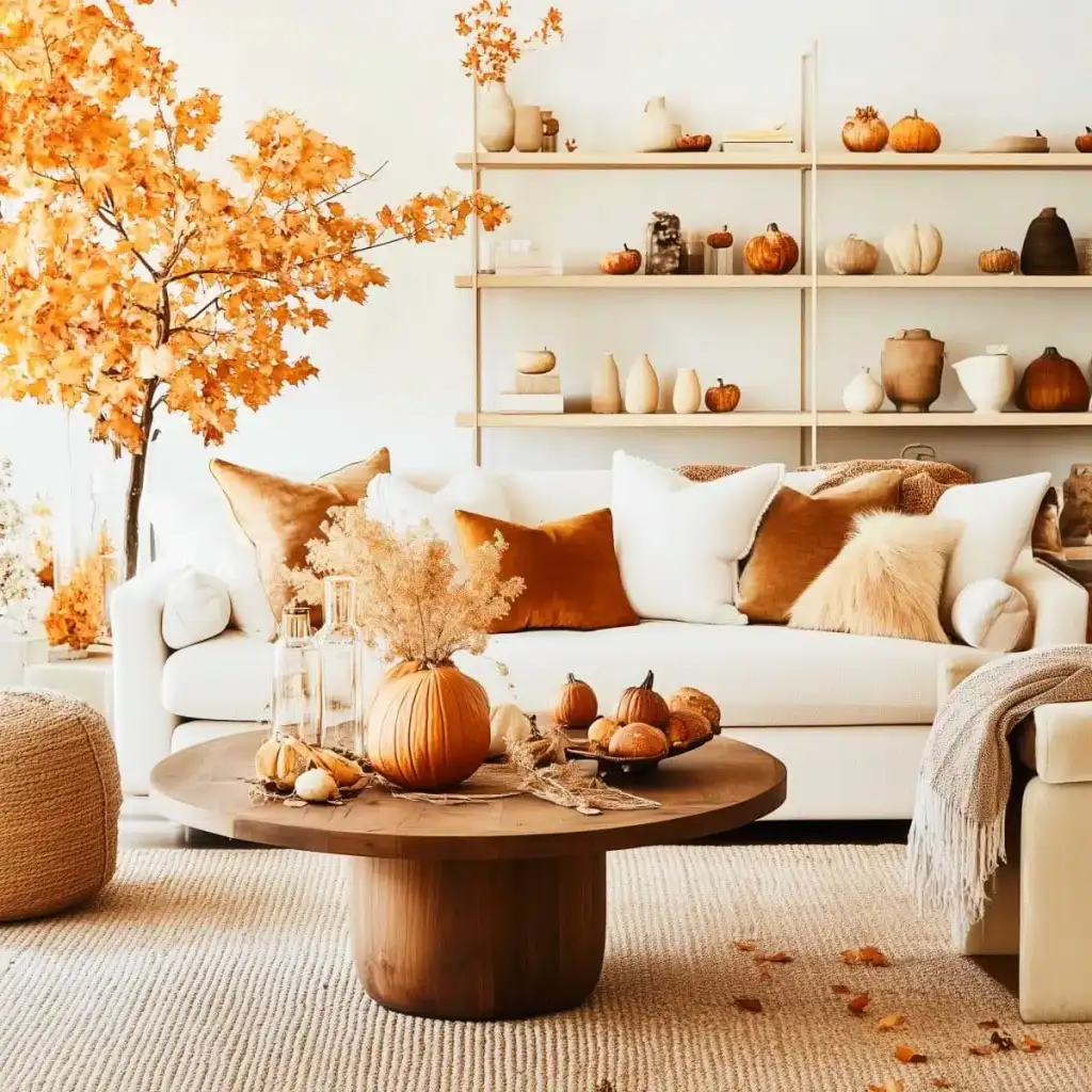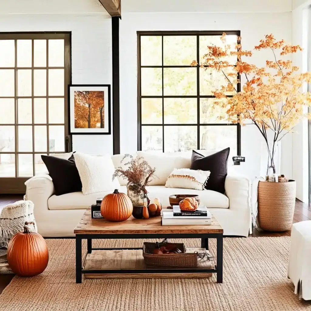 Κράτησε καθαρή αισθητική με 2 ή 3 εστίες ενδιαφέροντος σε κάθε χώρο. Η υπερφόρτωση κουράζει και μειώνει την αίσθηση ποιότητας. Εστίασε σε ένα τραπεζάκι σαλονιού, το ράφι του τζακιού, τον μπουφέ της τραπεζαρίας ή το τραπέζι της βεράντας. Χρησιμοποίησε κολοκύθες σε δίσκο με κεριά, κλαδιά με φύλλα σε λευκό βάζο και έναν πίνακα με φθινοπωρινό τοπίο ως ήσυχο φόντο.