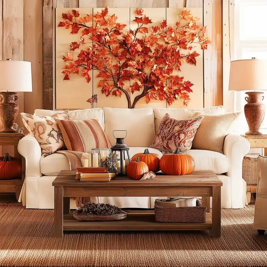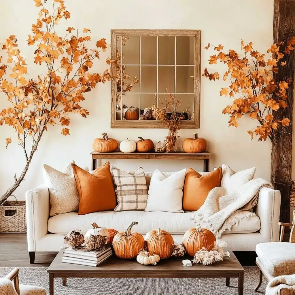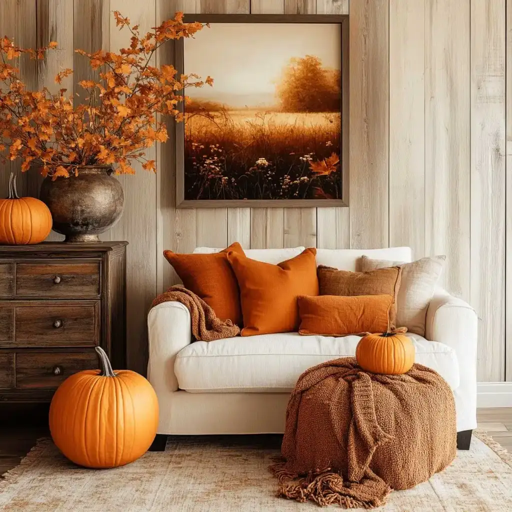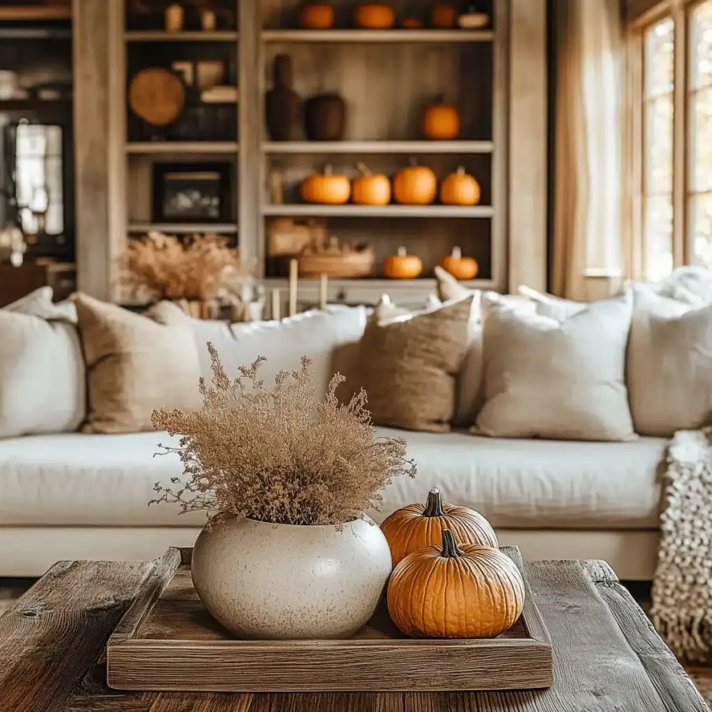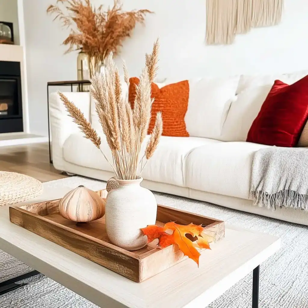Κράτησε καθαρή αισθητική με 2 ή 3 εστίες ενδιαφέροντος σε κάθε χώρο. Η υπερφόρτωση κουράζει και μειώνει την αίσθηση ποιότητας. Εστίασε σε ένα τραπεζάκι σαλονιού, το ράφι του τζακιού, τον μπουφέ της τραπεζαρίας ή το τραπέζι της βεράντας. Χρησιμοποίησε κολοκύθες σε δίσκο με κεριά, κλαδιά με φύλλα σε λευκό βάζο και έναν πίνακα με φθινοπωρινό τοπίο ως ήσυχο φόντο.