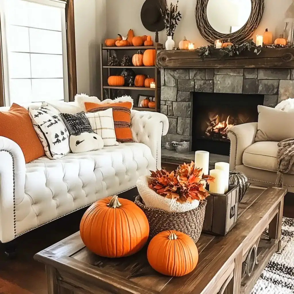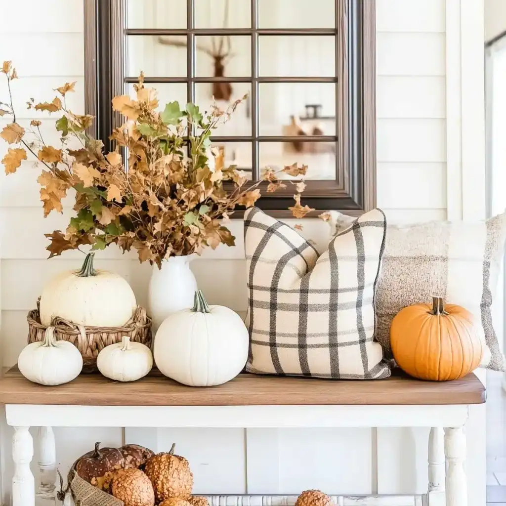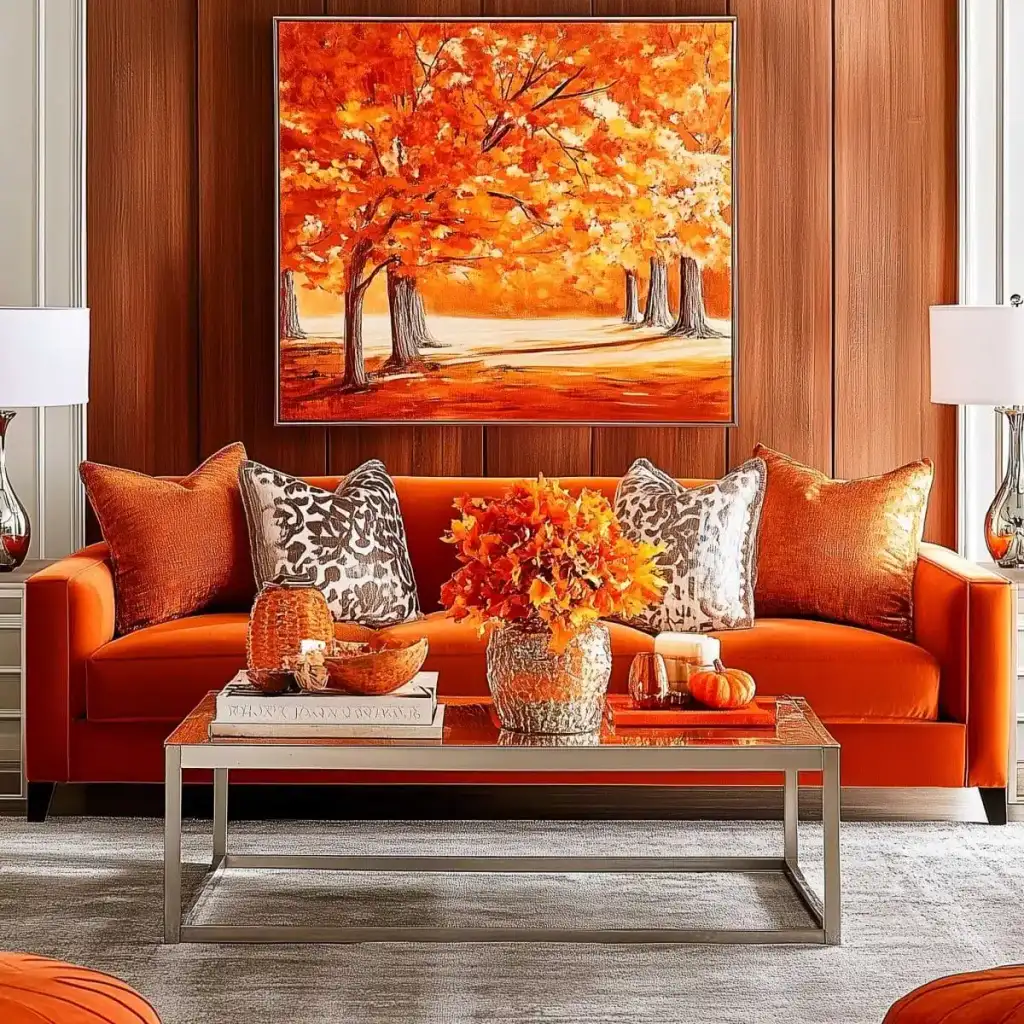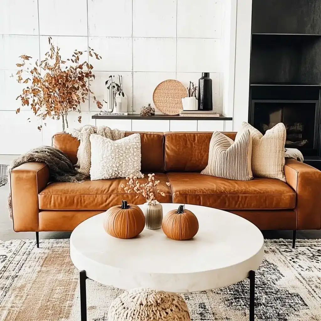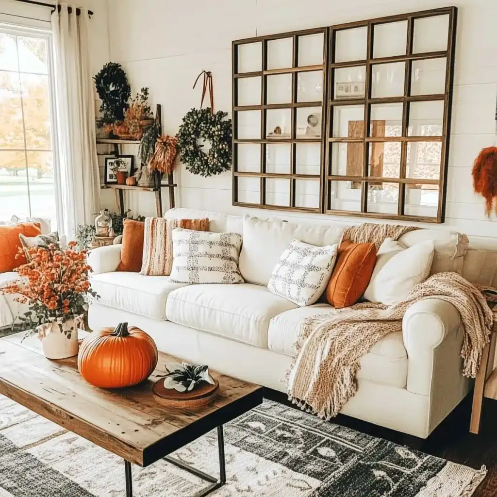 Κράτησε καθαρή αισθητική με 2 ή 3 εστίες ενδιαφέροντος σε κάθε χώρο. Η υπερφόρτωση κουράζει και μειώνει την αίσθηση ποιότητας. Εστίασε σε ένα τραπεζάκι σαλονιού, το ράφι του τζακιού, τον μπουφέ της τραπεζαρίας ή το τραπέζι της βεράντας. Χρησιμοποίησε κολοκύθες σε δίσκο με κεριά, κλαδιά με φύλλα σε λευκό βάζο και έναν πίνακα με φθινοπωρινό τοπίο ως ήσυχο φόντο.