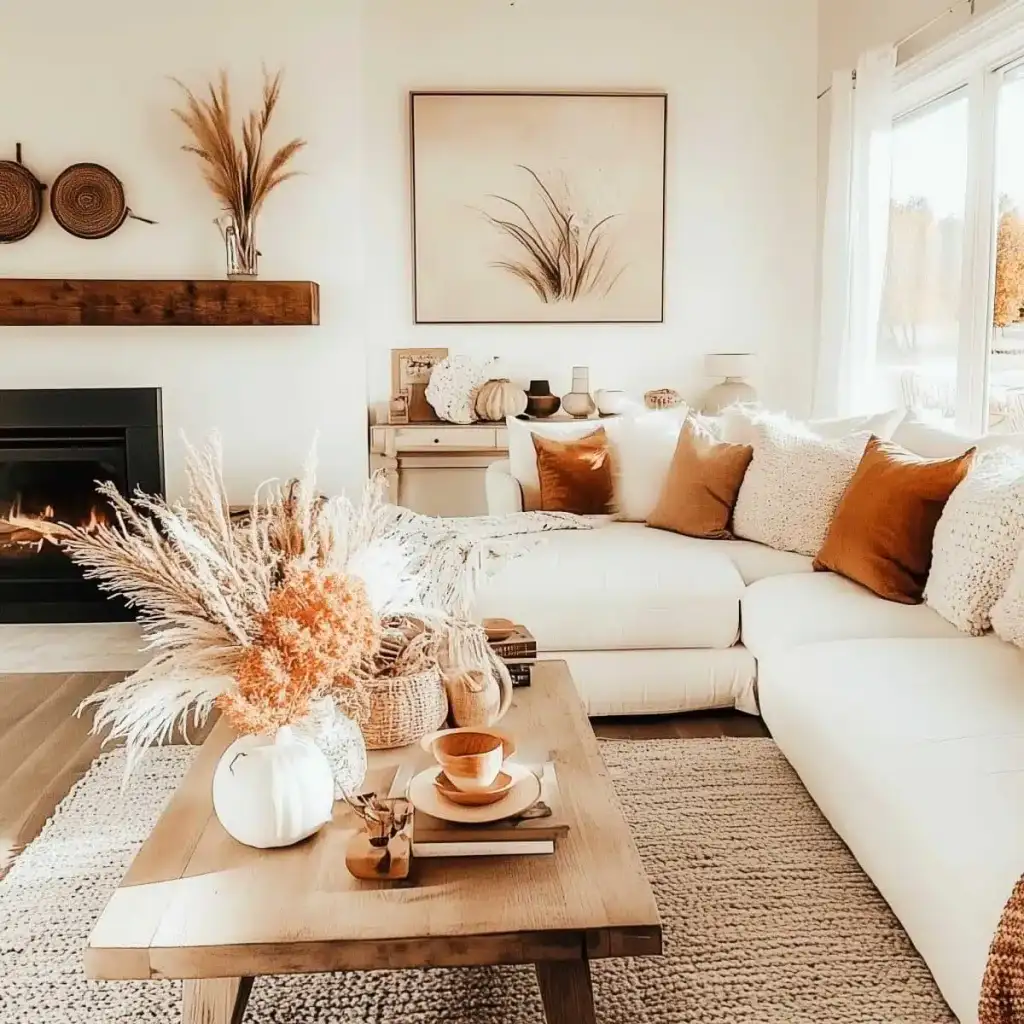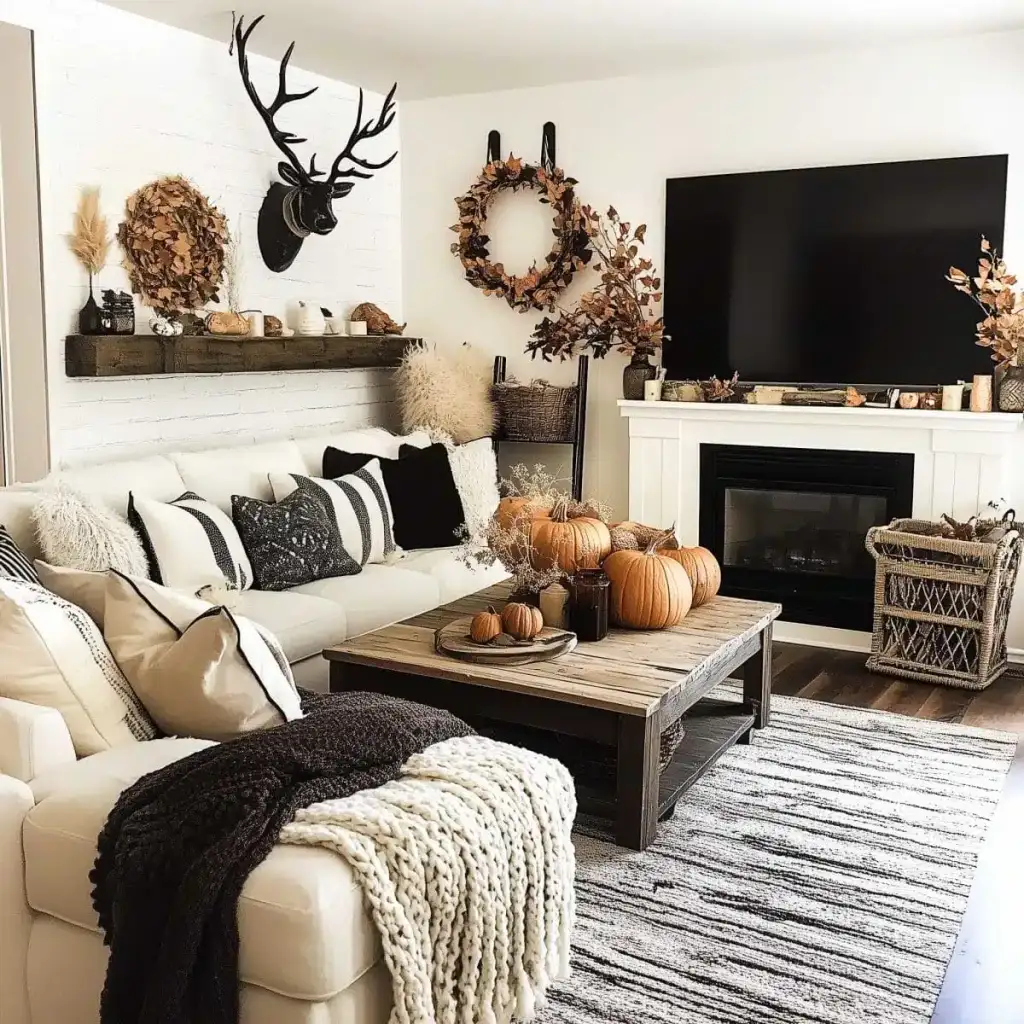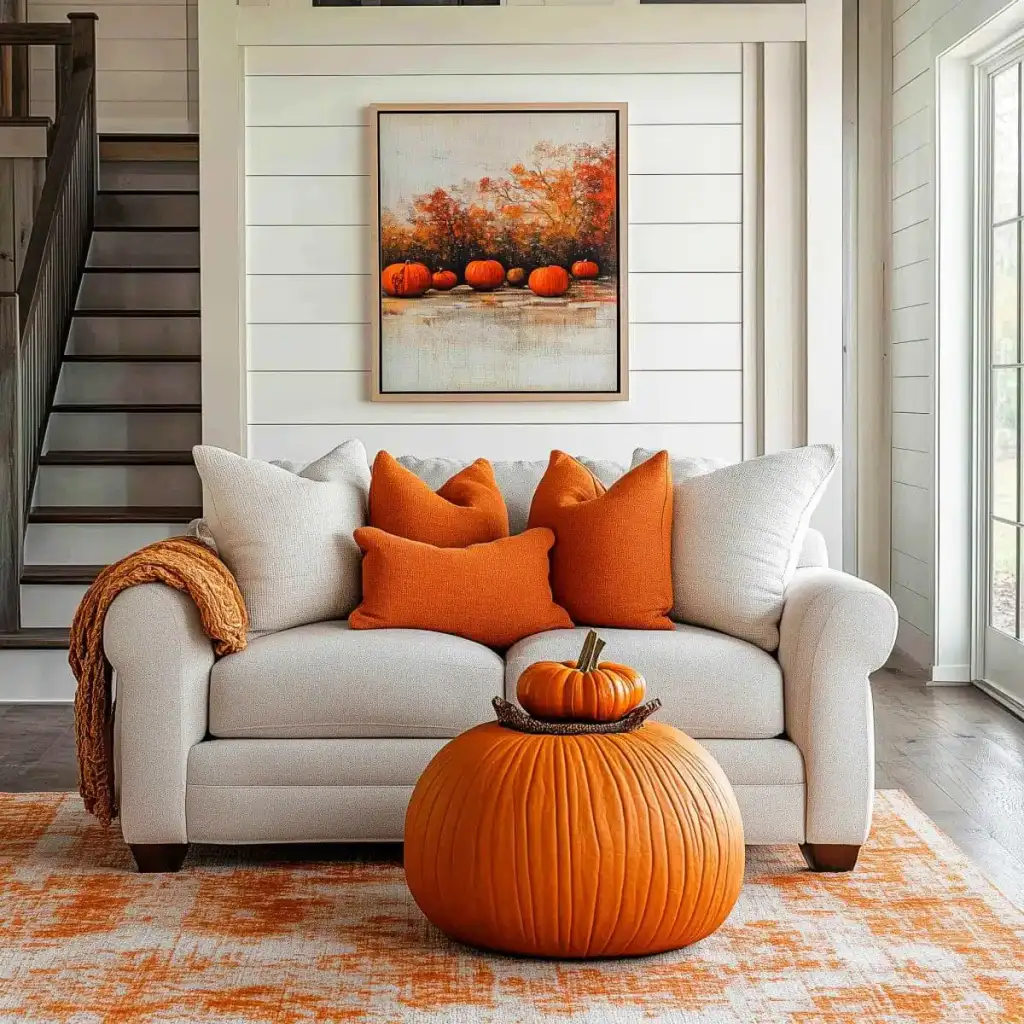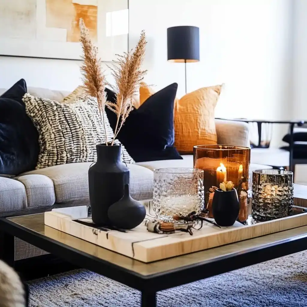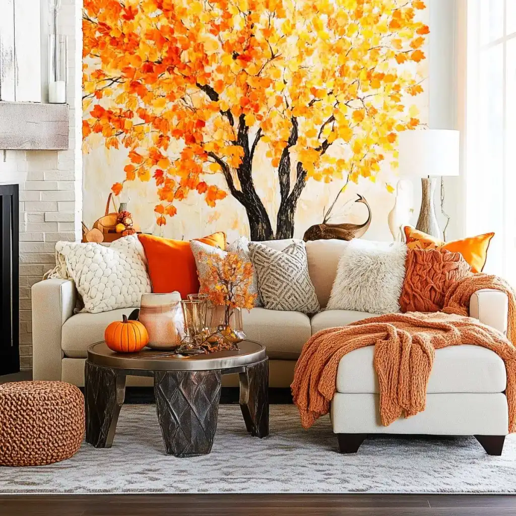 Κράτησε καθαρή αισθητική με 2 ή 3 εστίες ενδιαφέροντος σε κάθε χώρο. Η υπερφόρτωση κουράζει και μειώνει την αίσθηση ποιότητας. Εστίασε σε ένα τραπεζάκι σαλονιού, το ράφι του τζακιού, τον μπουφέ της τραπεζαρίας ή το τραπέζι της βεράντας. Χρησιμοποίησε κολοκύθες σε δίσκο με κεριά, κλαδιά με φύλλα σε λευκό βάζο και έναν πίνακα με φθινοπωρινό τοπίο ως ήσυχο φόντο.