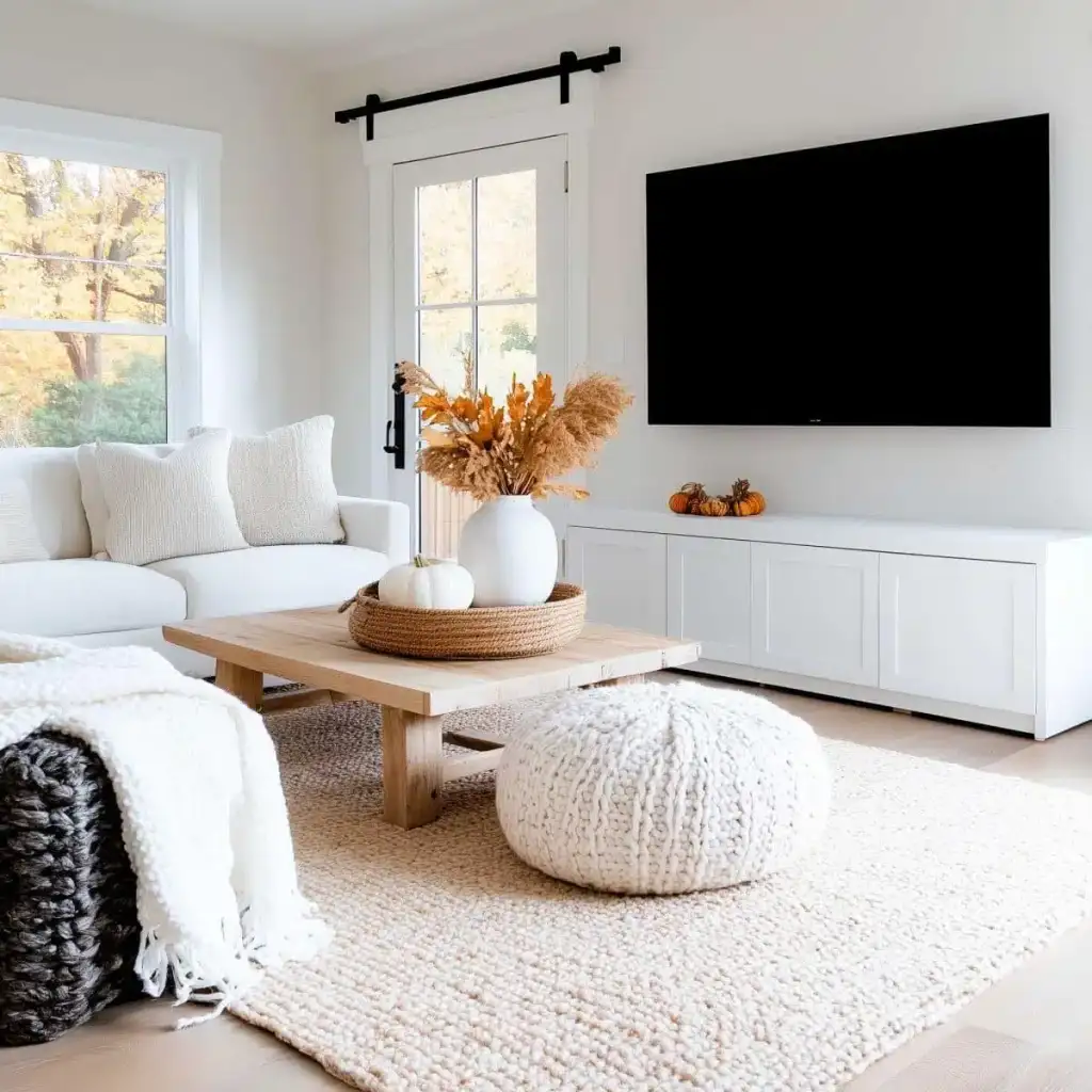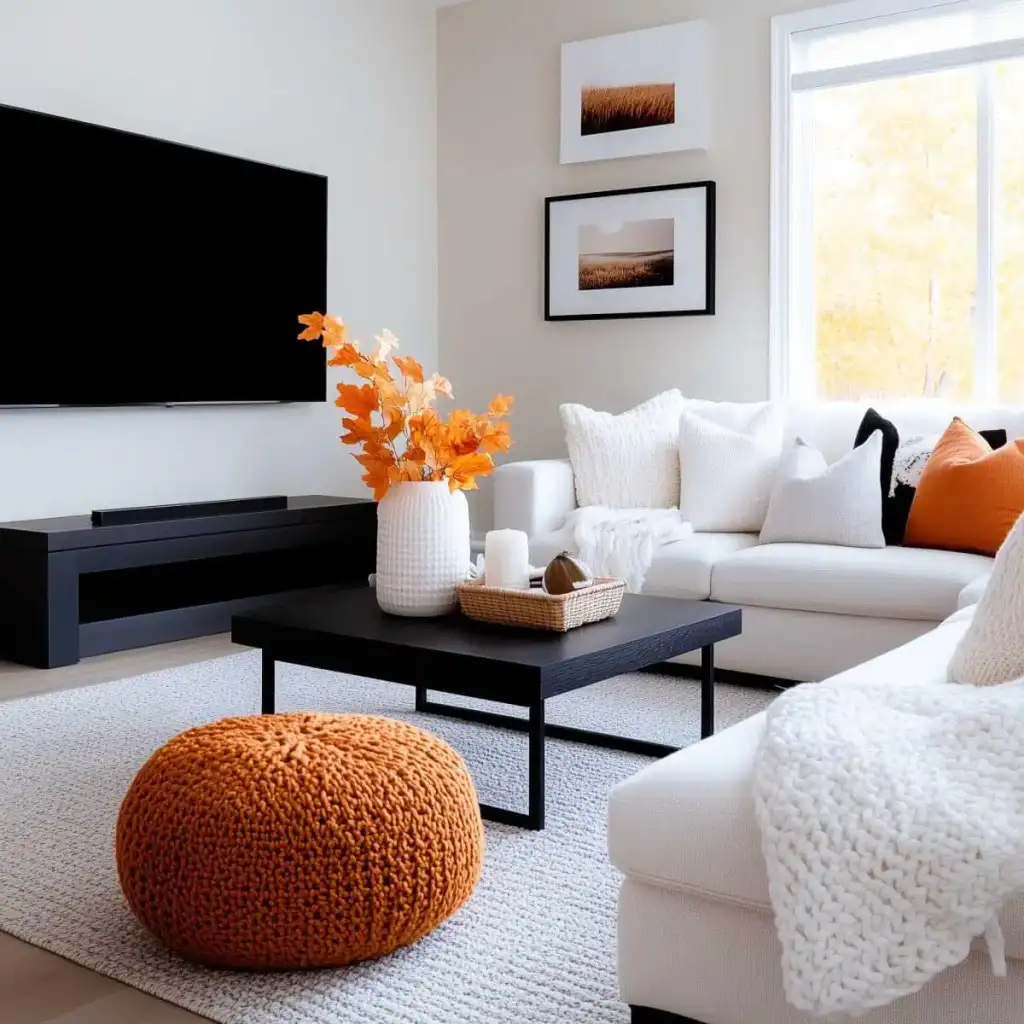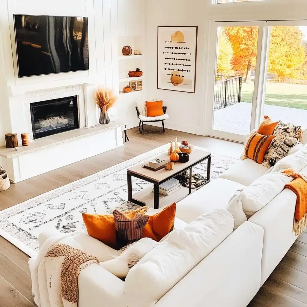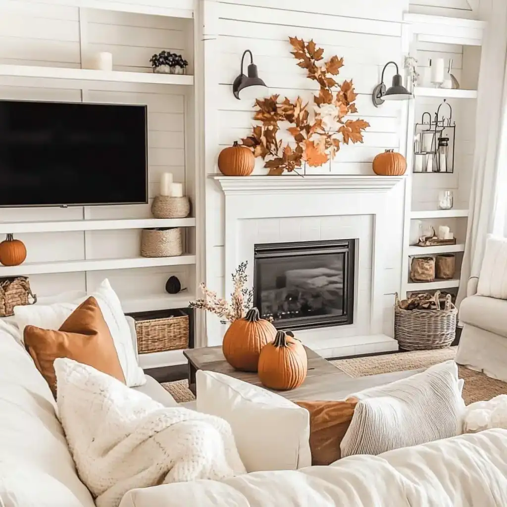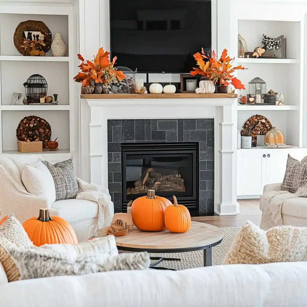 Κράτησε καθαρή αισθητική με 2 ή 3 εστίες ενδιαφέροντος σε κάθε χώρο. Η υπερφόρτωση κουράζει και μειώνει την αίσθηση ποιότητας. Εστίασε σε ένα τραπεζάκι σαλονιού, το ράφι του τζακιού, τον μπουφέ της τραπεζαρίας ή το τραπέζι της βεράντας. Χρησιμοποίησε κολοκύθες σε δίσκο με κεριά, κλαδιά με φύλλα σε λευκό βάζο και έναν πίνακα με φθινοπωρινό τοπίο ως ήσυχο φόντο.
