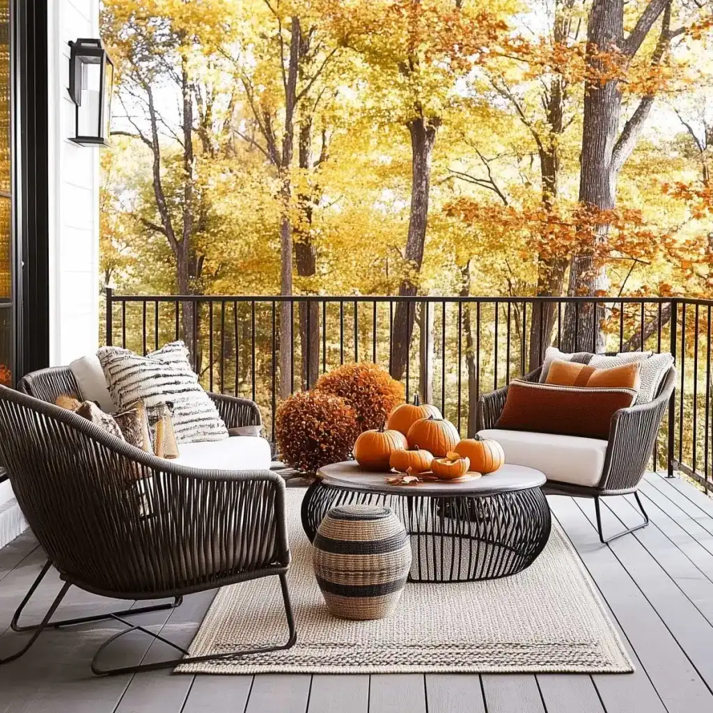 Στήσε καθιστικό με μαξιλάρια και ριχτάρια σε ζεστές αποχρώσεις. Ένα ριγέ χαλί ορίζει τη ζώνη και βοηθά στη διακόσμηση. Διάσπαρτες κολοκύθες σε 2 ή 3 αποχρώσεις δείχνουν επιμελημένο αποτέλεσμα. Σε ξύλινο τραπέζι, βάλε φύλλα και ένα χαμηλό κηροπήγιο. Αν έχεις πέργκολα ή ξύλινη οροφή, πέρασε λαμπάκια για απαλό, ομοιόμορφο φως τα βράδια.