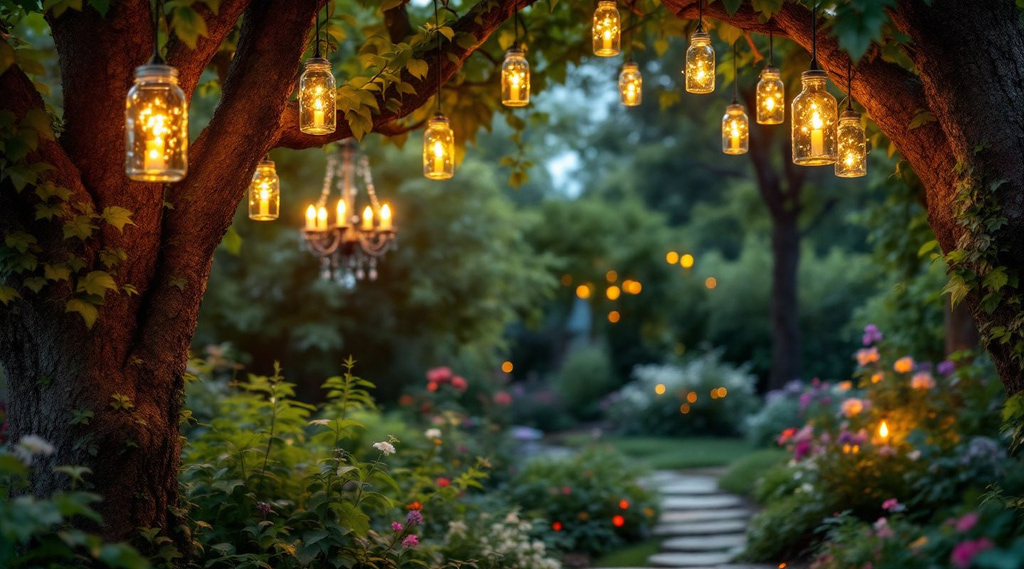 Βάζα από μαρμελάδα μπορούν να γίνουν υπέροχα ηλιακά φαναράκια – απλώς τοποθετήστε μέσα ένα μικρό ηλιακό φωτάκι και δείτε τον κήπο σας να λάμπει το βράδυ. Άδεια μπουκάλια κρασιού μπορούν να γίνουν κρεμαστά δαδιά, ενώ ένα παλιό πολυέλαιο μπορεί να πάρει νέα ζωή με LED κεριά και να κρεμαστεί από κάποιο δέντρο σαν παραμύθι.