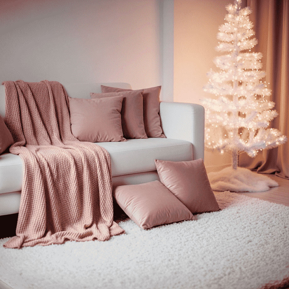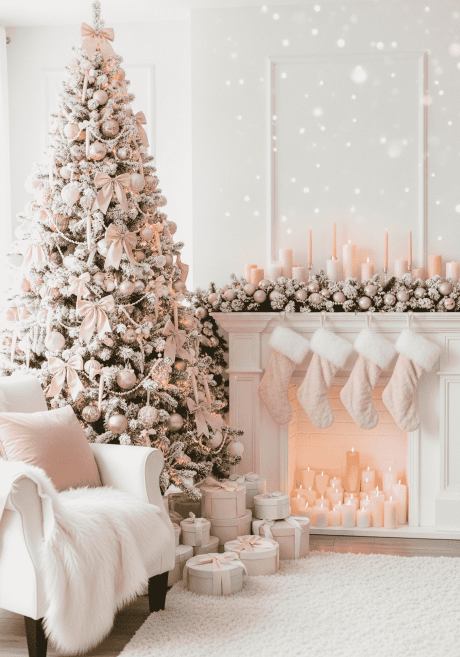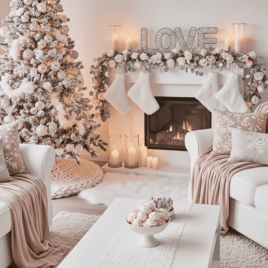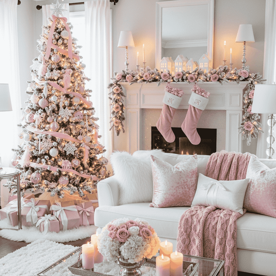 Φαντάσου ένα σαλόνι με μια απαλή ροζ ριχτή κουβέρτα πάνω σε λευκό καναπέ, μερικά μαξιλάρια σε ροζ πούδρα και ένα λευκό δέντρο στη γωνία. Τώρα πρόσθεσε μερικά ροζ στολίδια, ζεστά φωτάκια και ίσως ένα αφράτο χαλί. Ο χώρος αμέσως δείχνει ήσυχος και ζεστός, σαν σκηνή από χριστουγεννιάτικη ρομαντική ταινία.