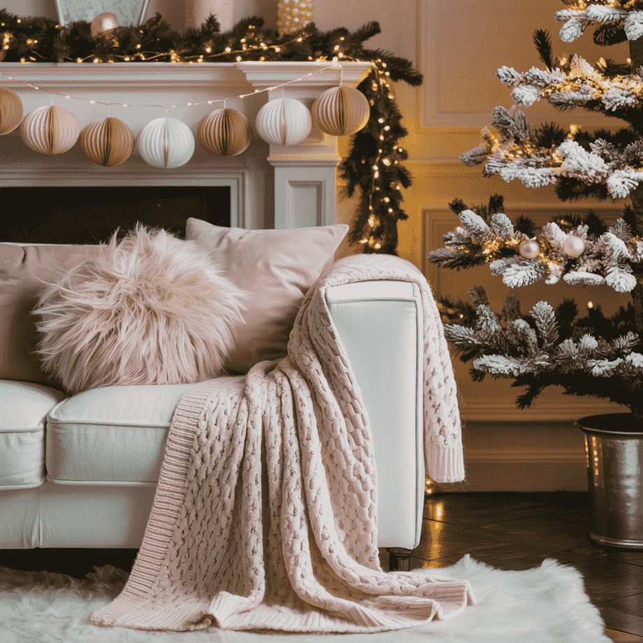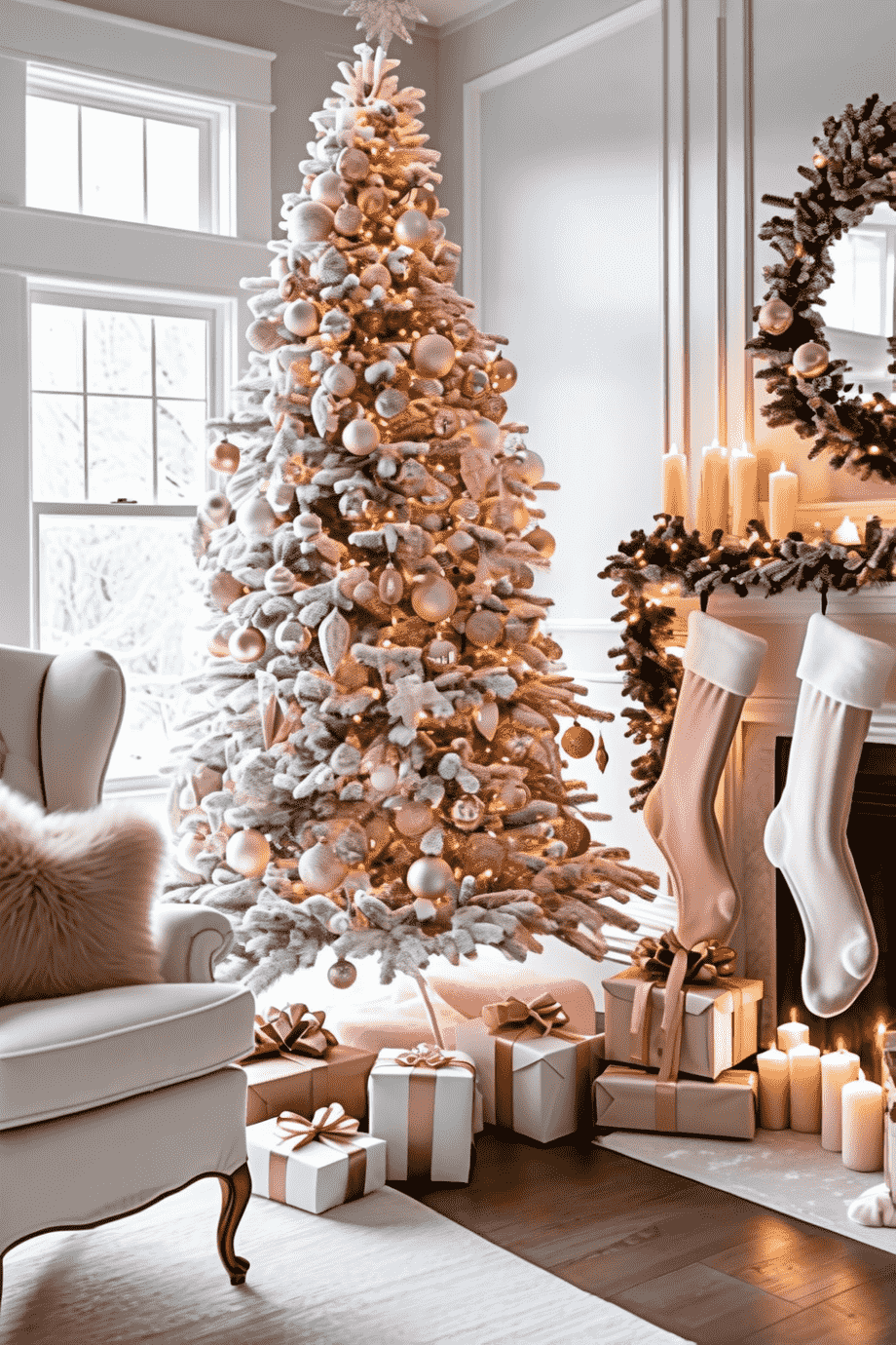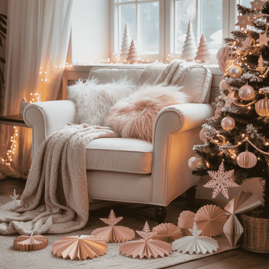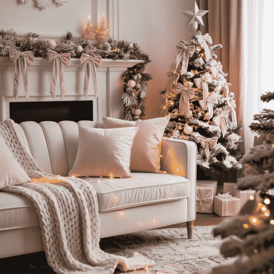 Φαντάσου ένα σαλόνι με μια απαλή ροζ ριχτή κουβέρτα πάνω σε λευκό καναπέ, μερικά μαξιλάρια σε ροζ πούδρα και ένα λευκό δέντρο στη γωνία. Τώρα πρόσθεσε μερικά ροζ στολίδια, ζεστά φωτάκια και ίσως ένα αφράτο χαλί. Ο χώρος αμέσως δείχνει ήσυχος και ζεστός, σαν σκηνή από χριστουγεννιάτικη ρομαντική ταινία.