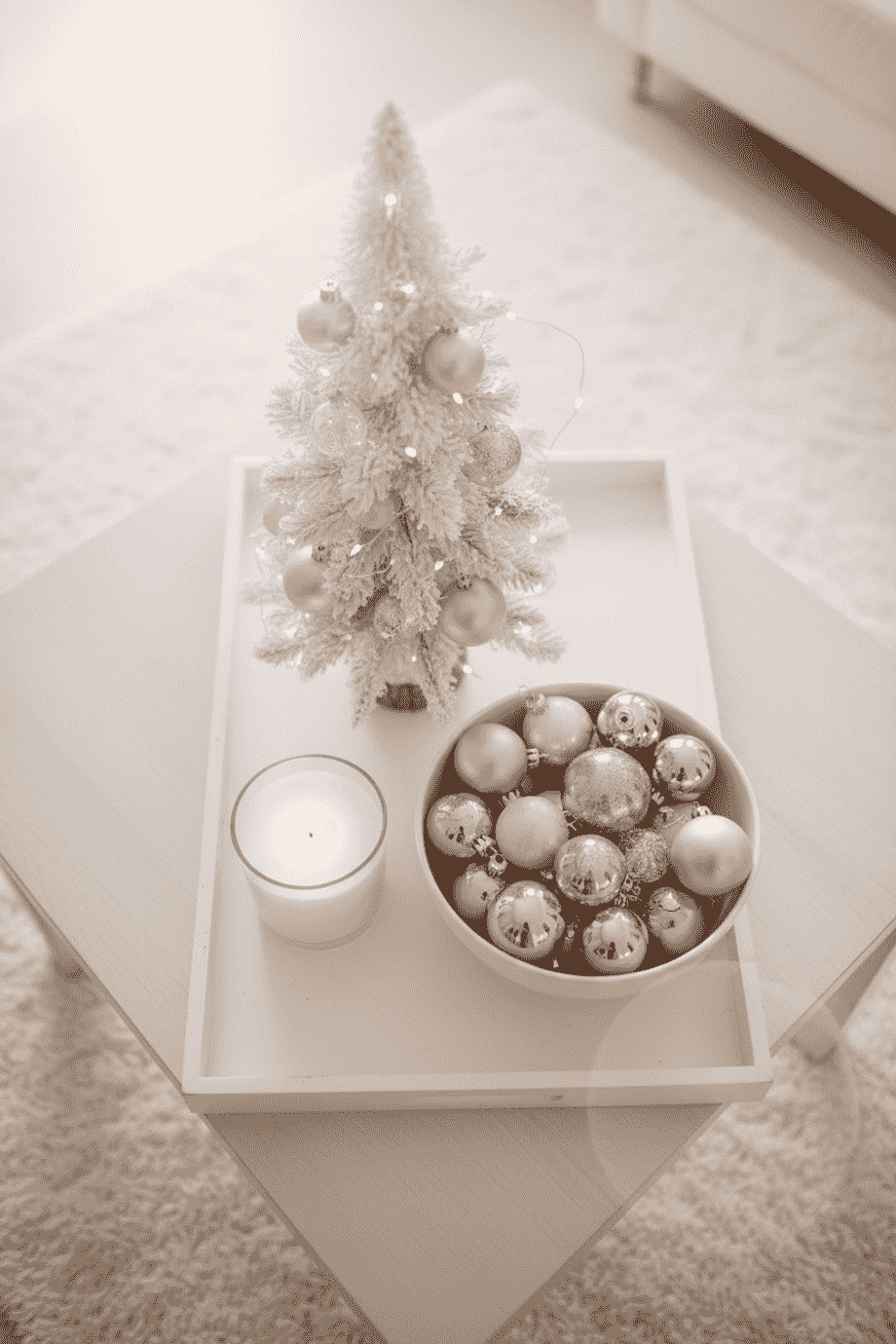 Πριν διακοσμήσεις ολόκληρο το δωμάτιο, δοκίμασε μικρές συνθέσεις. Διακόσμησε έναν δίσκο με ένα λευκό κερί, ένα ροζ στολίδι και ένα σαμπανιζέ κουδουνάκι. Αν αυτή η μικρή ομάδα σου φαίνεται ήρεμη και όμορφη, τότε έχεις βρει τη σωστή ισορροπία. Μετά μπορείς να επαναλάβεις τον ίδιο συνδυασμό στο δέντρο, στο τζάκι και στα ράφια.