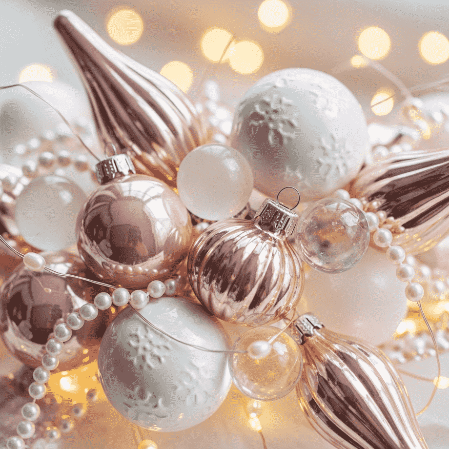 Ομαδοποίησε τα στολίδια σε τριάδες, στην ίδια χρωματική οικογένεια ή σε απαλό μείγμα από ροζ, λευκό και διάφανο. Αυτές οι μικρές ομάδες δείχνουν πιο προσεγμένες από τα στολίδια που είναι απλωμένα τυχαία.