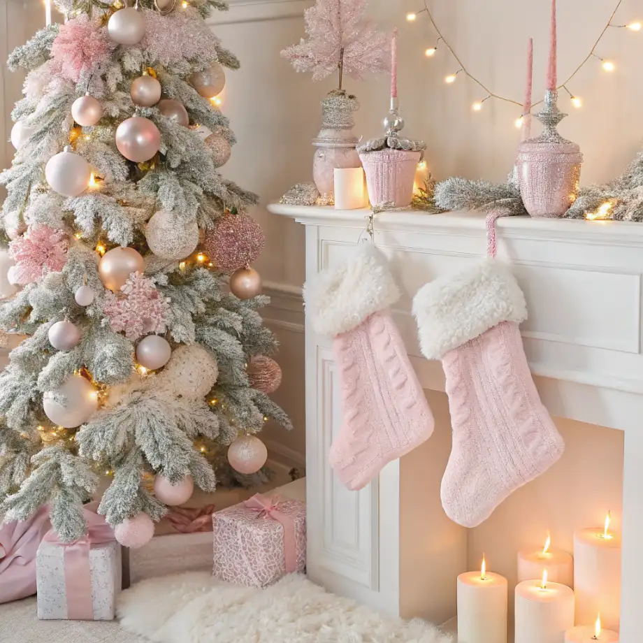 Διάλεξε λευκές ή ροζ χριστουγεννιάτικες κάλτσες με λεπτομέρειες, όπως δαντέλα, φουντάκια ή βελούδινες μανσέτες. Άφησε ένα κύριο στοιχείο να «πρωταγωνιστεί»: ή τις κάλτσες ή τα κεριά. Αν προσπαθήσεις να είναι όλα κεντρικά στοιχεία, το τζάκι θα δείχνει φορτωμένο. Μπορείς επίσης να προσθέσεις μερικές ιδέες με ροζ και λευκά κλαδιά για γιορτινά σπίτια για μια απαλή, φυσική πινελιά.