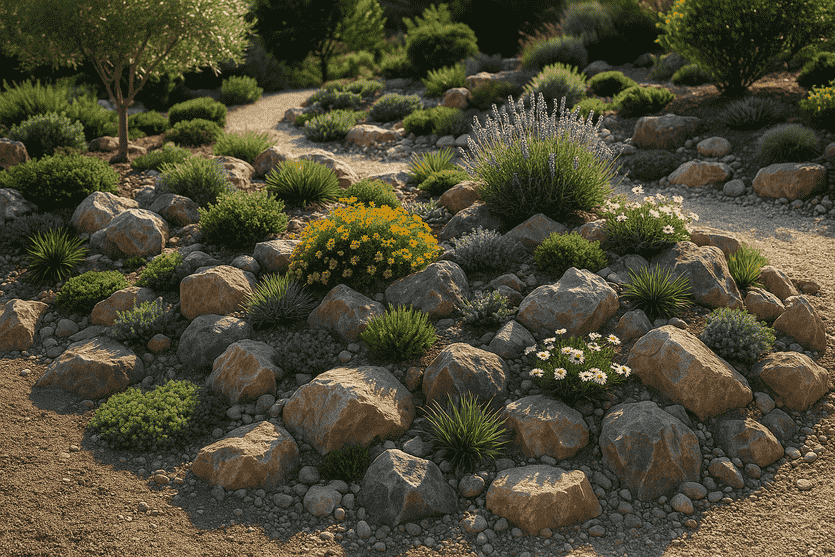 Τώρα δημιουργώ την αντίστοιχη εικόνα: ένας βραχόκηπος με επιλεγμένα μεσογειακά φυτά και παχύφυτα σε φυσική διάταξη.