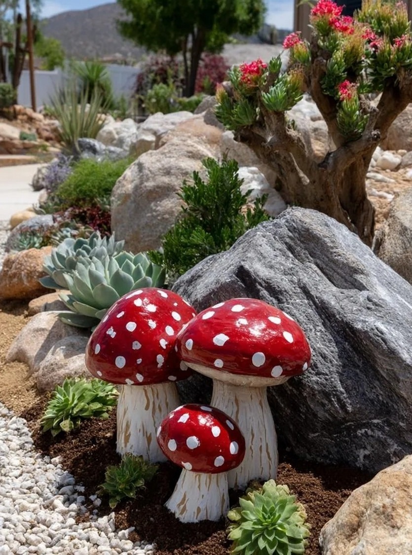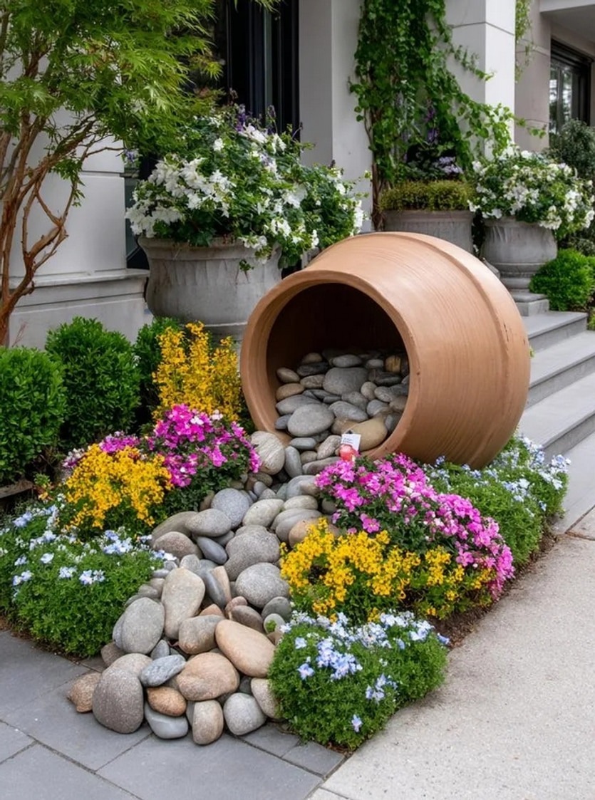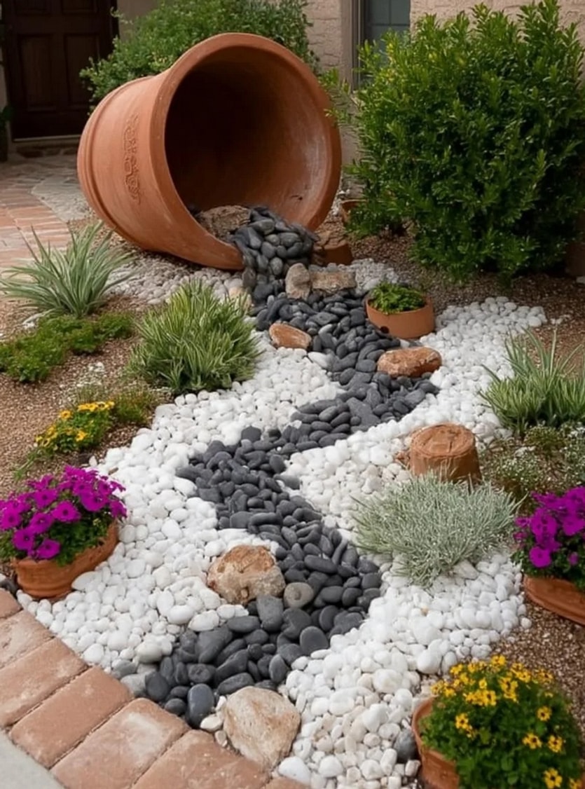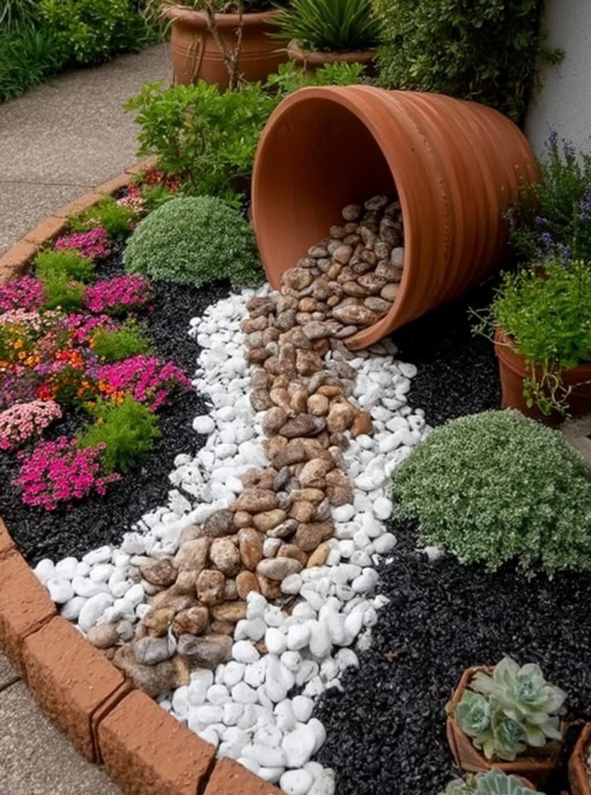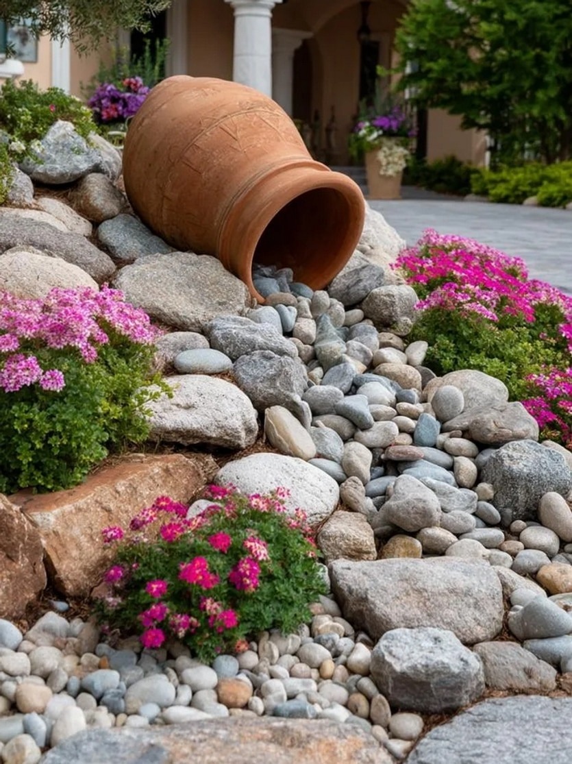 Η ποικιλία υλικών είναι το κλειδί για ένα μοναδικό αποτέλεσμα. Χρησιμοποιήστε μεγάλες πέτρες ως σημεία εστίασης, μικρότερα βότσαλα για αντίθεση, και χαλίκι για το φόντο. Προσθέστε ξύλινα στοιχεία (όπως κορμούς ή παλιά κιβώτια), κεραμικά αγγεία ή ακόμα και κομμάτια μεταλλικών αντικειμένων για πιο ρουστίκ ή βιομηχανικό στυλ.