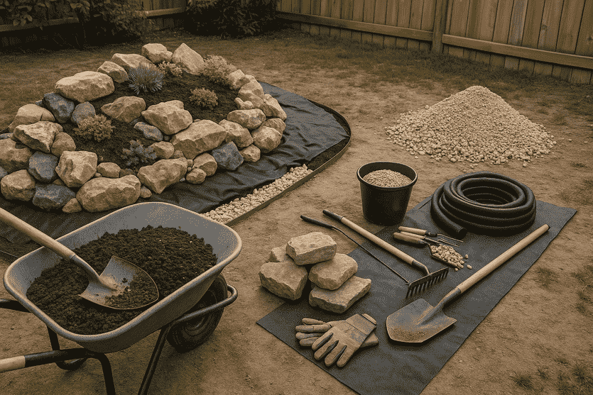 Θα χρειαστείτε πέτρες διαφόρων μεγεθών, χαλίκι ή βότσαλο, γεωύφασμα, κατάλληλο υπόστρωμα φύτευσης και βασικά εργαλεία όπως φτυάρι και γάντια. Τα περισσότερα υλικά είναι φιλικά προς το περιβάλλον και εύκολα στην εύρεση.