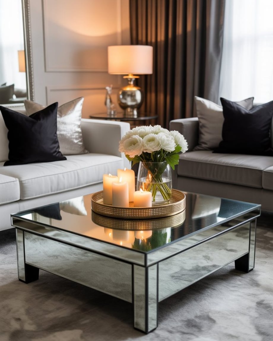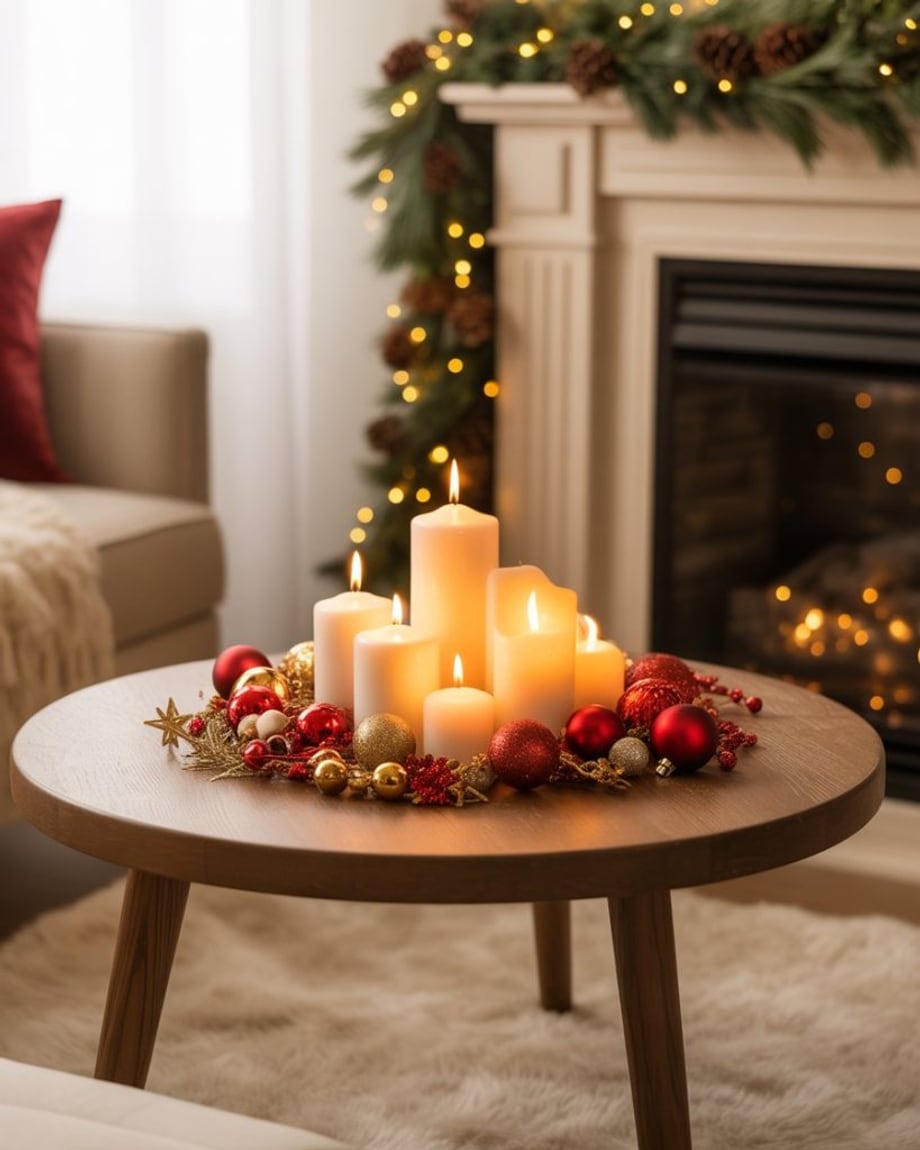 Διάλεξε δίσκο καθρέφτη ή μέταλλο, κρυστάλλινο βάζο με φρέσκα λουλούδια και ζευγάρι κεριά. Τήρησε ισορροπία αριστερά δεξιά για ήρεμη εικόνα. Λιτή λάμψη, χωρίς υπερβολή.