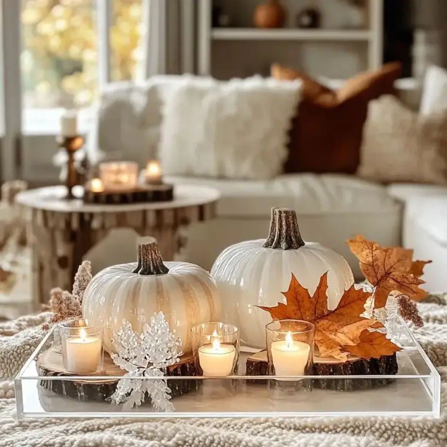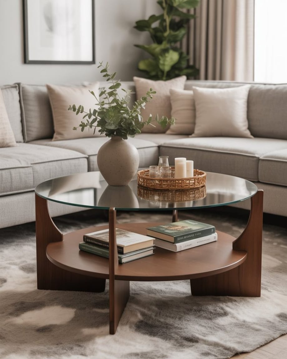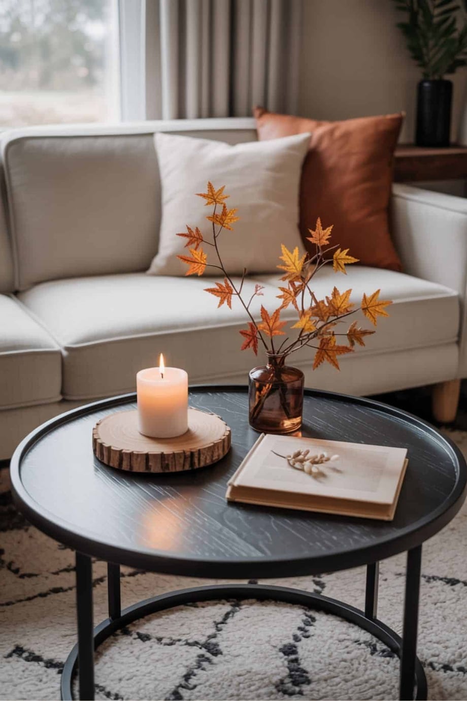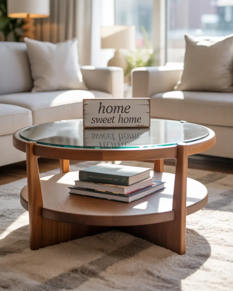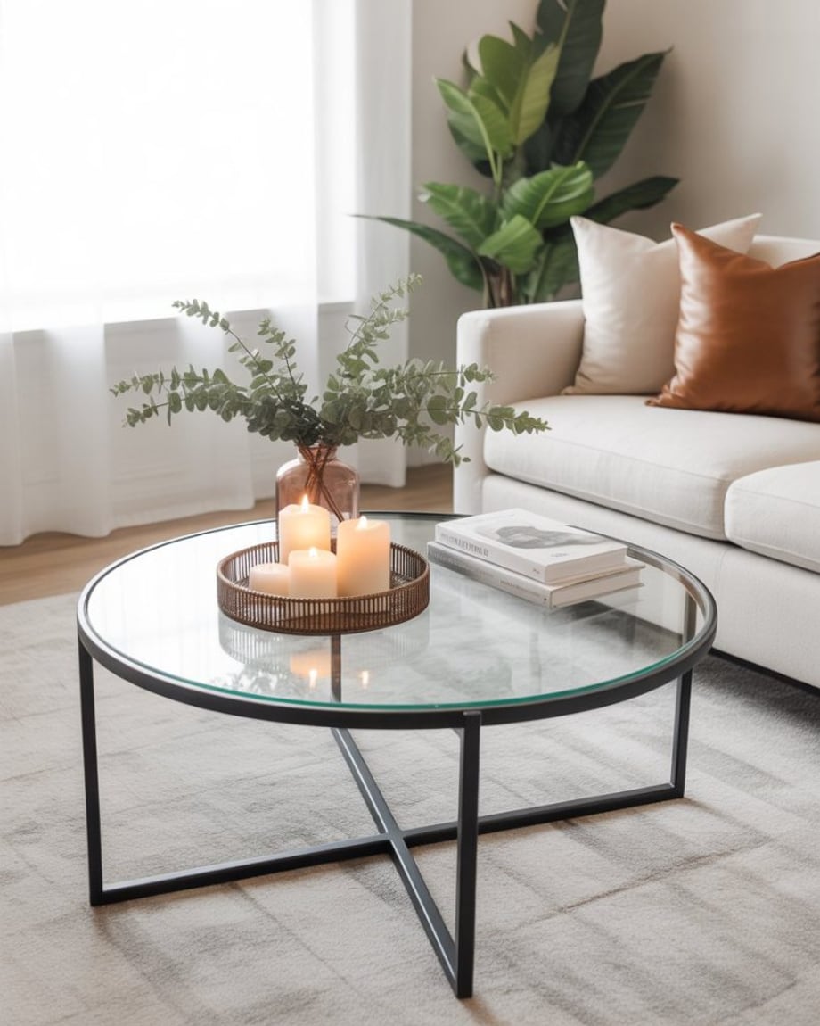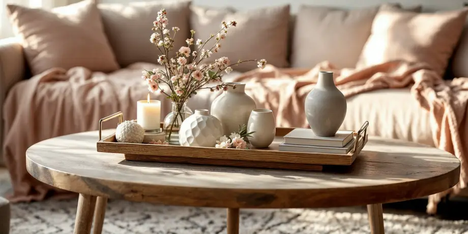 Μάζεψε μικροαντικείμενα σε έναν δίσκο για τάξη. Πρόσθεσε 1 με 2 βιβλία τραπεζιού σαλονιού για ύψος και υφή. Αν υπάρχει ράφι ή συρτάρι, εκμεταλλεύσου το για αποθήκευση.
