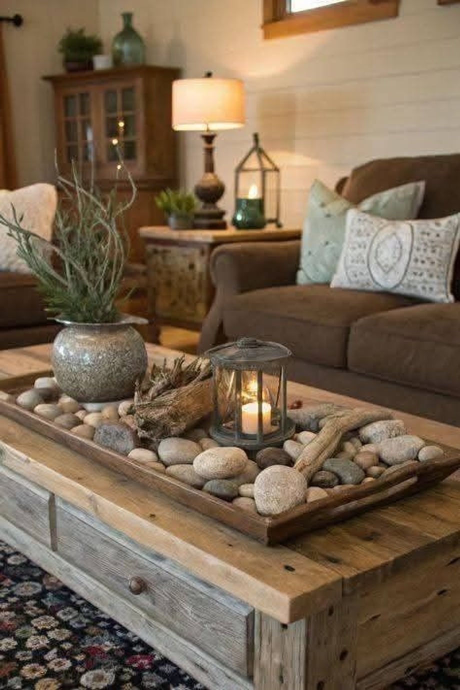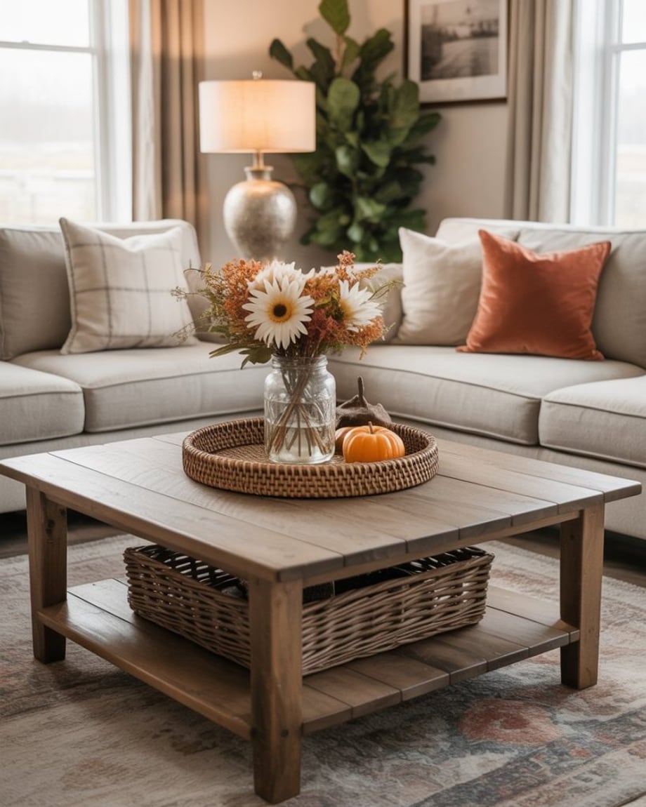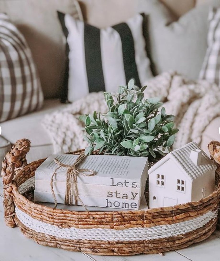 Στήσε ψάθινο δίσκο, κεραμικό βάζο με αποξηραμένα, βιβλίο τέχνης με γήινο εξώφυλλο. Βάλε λινό σουπλά κάτω από τον δίσκο για στρώσεις. Ζεσταίνει, οργανώνει, δείχνει επιμελημένο.