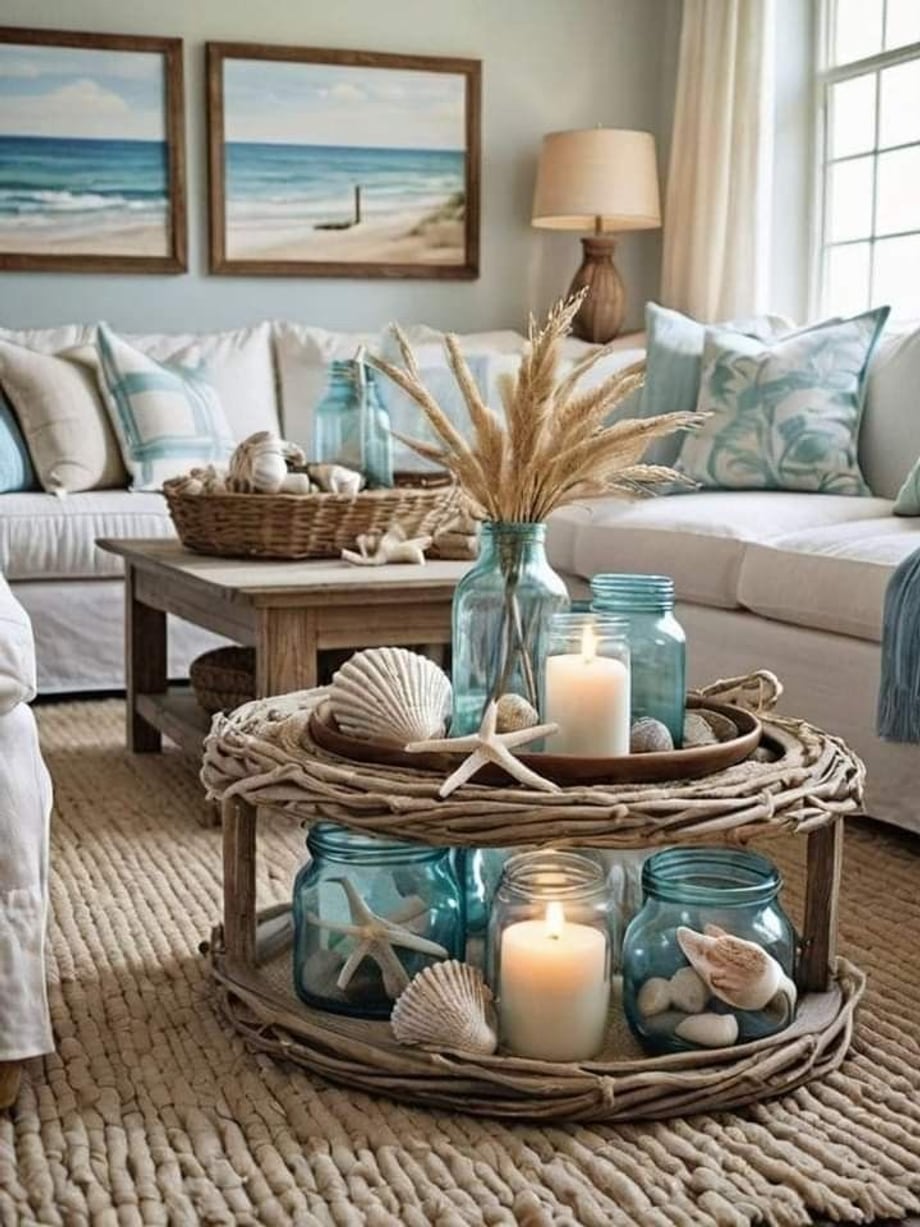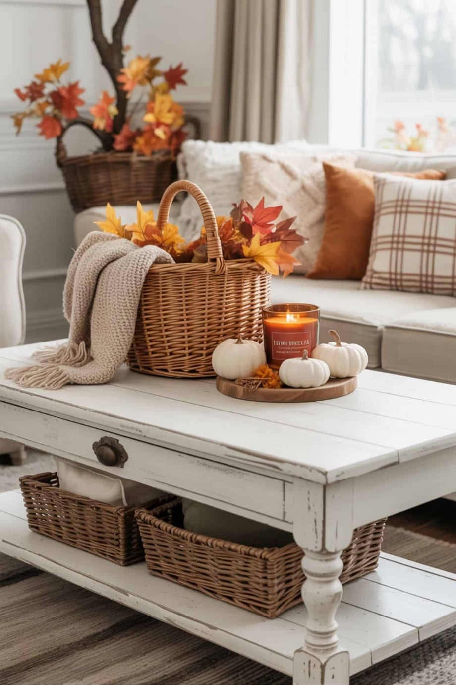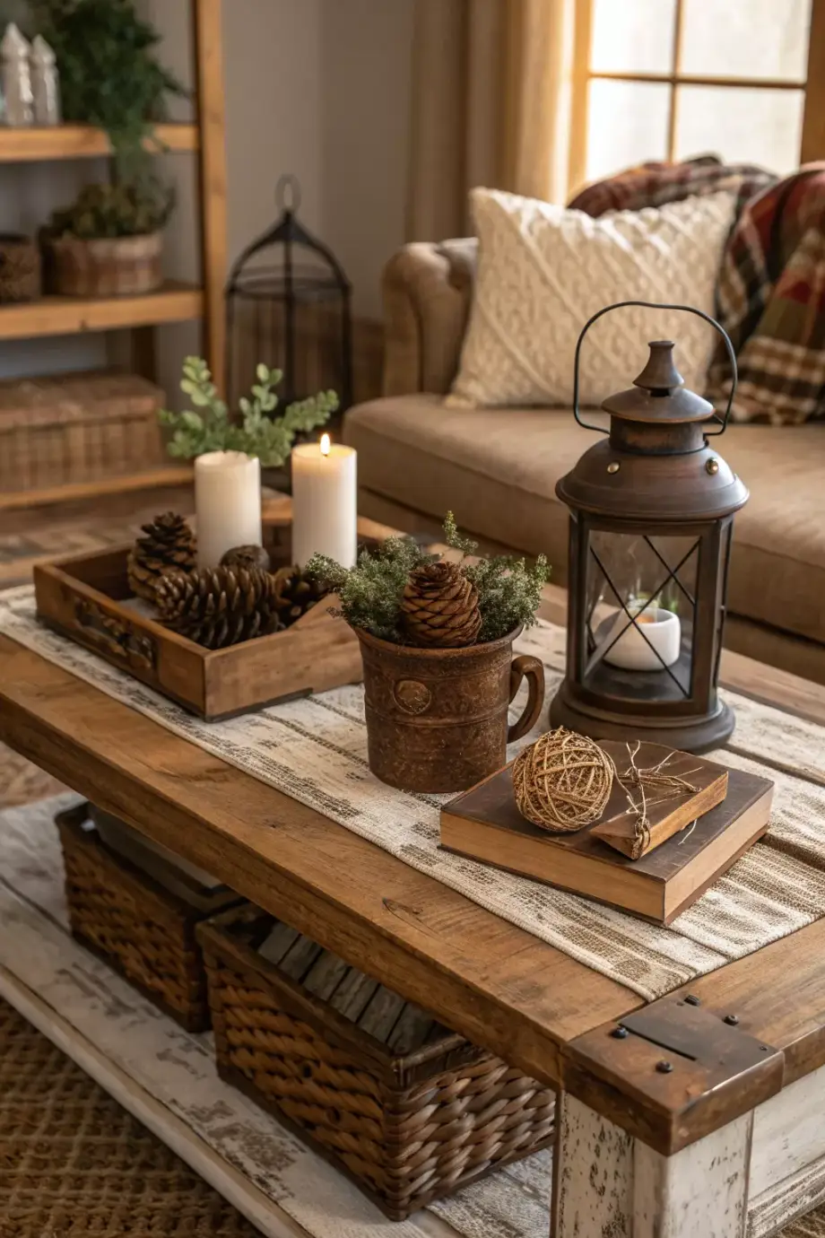 Στήσε ψάθινο δίσκο, κεραμικό βάζο με αποξηραμένα, βιβλίο τέχνης με γήινο εξώφυλλο. Βάλε λινό σουπλά κάτω από τον δίσκο για στρώσεις. Ζεσταίνει, οργανώνει, δείχνει επιμελημένο.