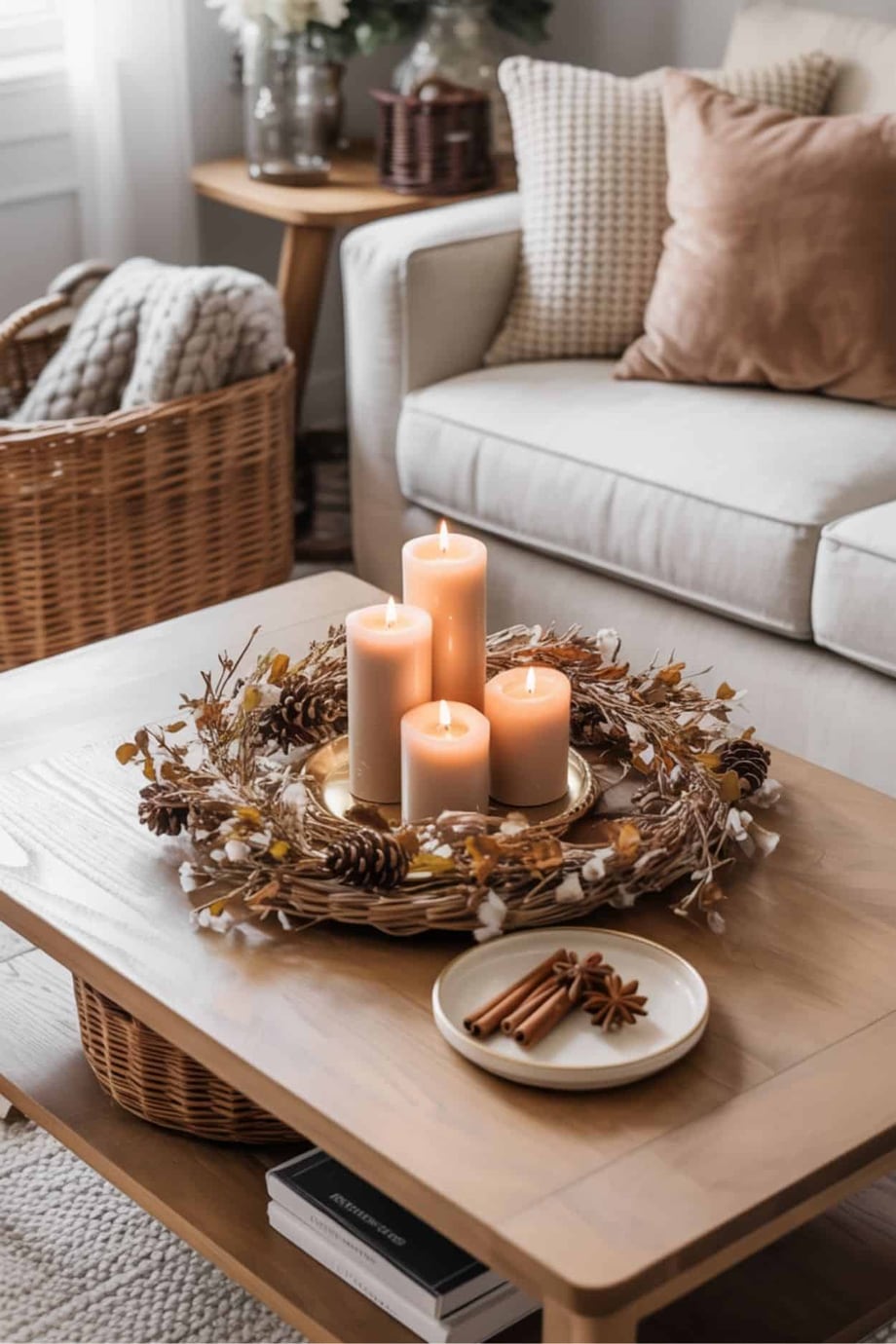 Βάλε 1 με 2 μικρά φυτά ή μια χαμηλή ανθοσύνθεση. Συνδύασε 1 με 2 κεριά ή diffuser, πάντα με προσοχή στην ασφάλεια. Κράτα χαμηλό ύψος για να μην κόβεται η ορατότητα στην τηλεόραση ή στη συζήτηση.