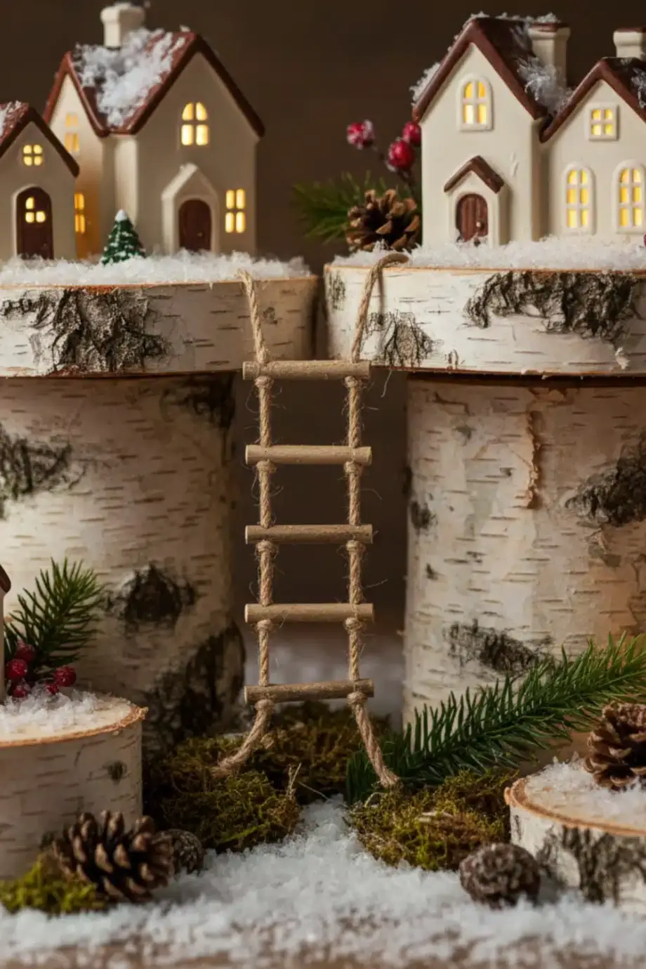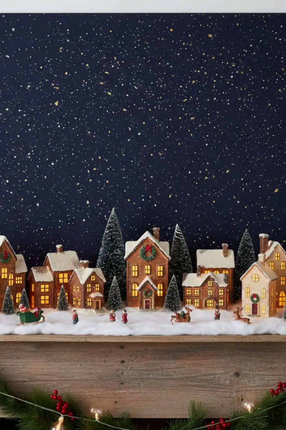 Συνδύασε ξύλινα σπιτάκια με μικρά κλαδιά, πετραδάκια, κουκουνάρια και ψεύτικο χιόνι. Στήσε το χωριό σου σαν μικρό βουνό μέσα στο σαλόνι, με δρόμους από πετραδάκια και «δάσος» από μίνι έλατα.