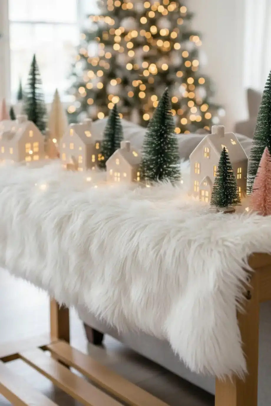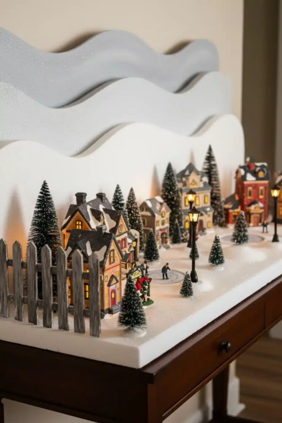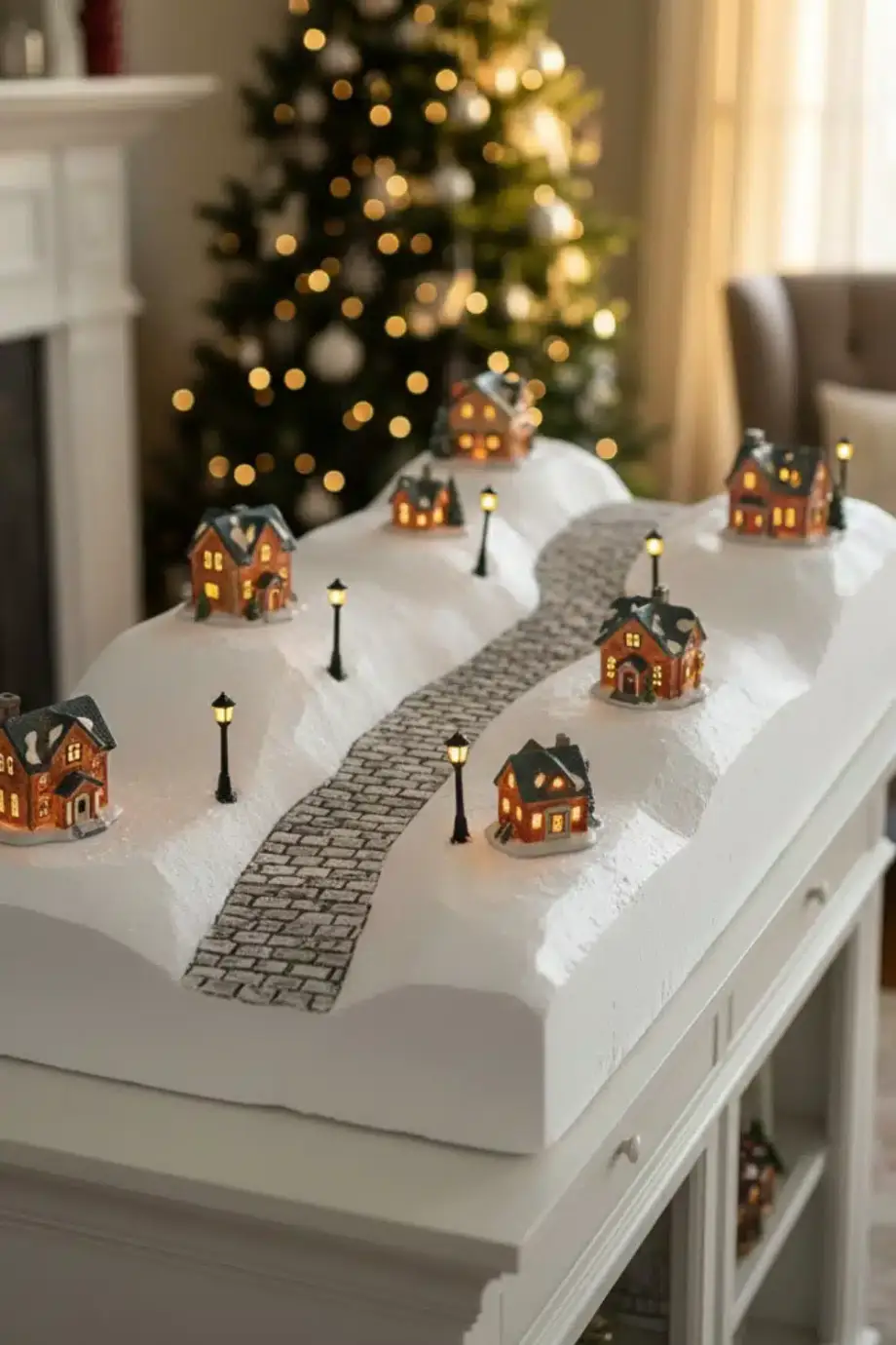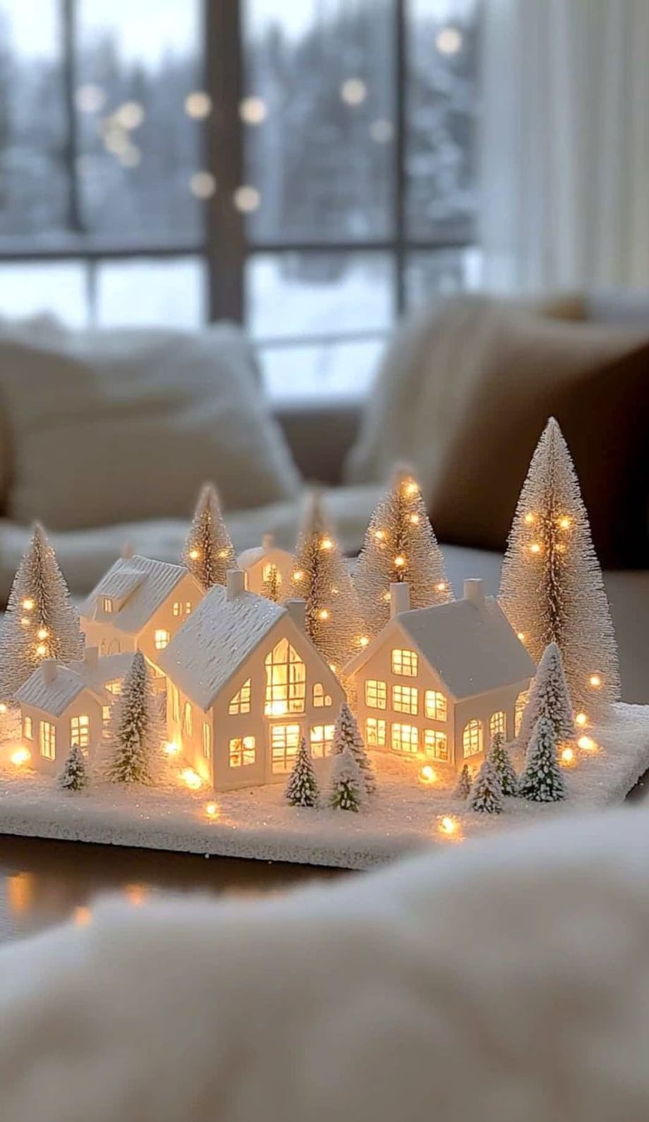 Γύρω μπορείς να βάλεις γούνινα μαξιλάρια ή ένα χοντρό ριχτάρι, ώστε να δείχνει σαν χιονισμένη γωνιά χαλάρωσης. Κράτα το φόντο σε μπεζ, κρεμ ή απαλό γκρι, για να ξεχωρίζει το χωριό και να μη χάνεται μέσα στα χρώματα.