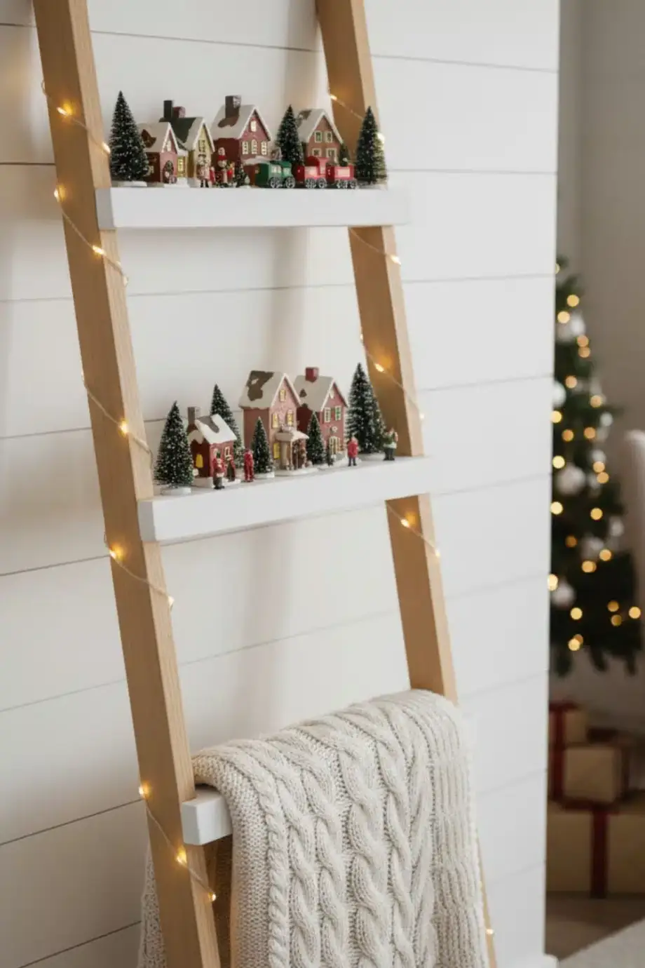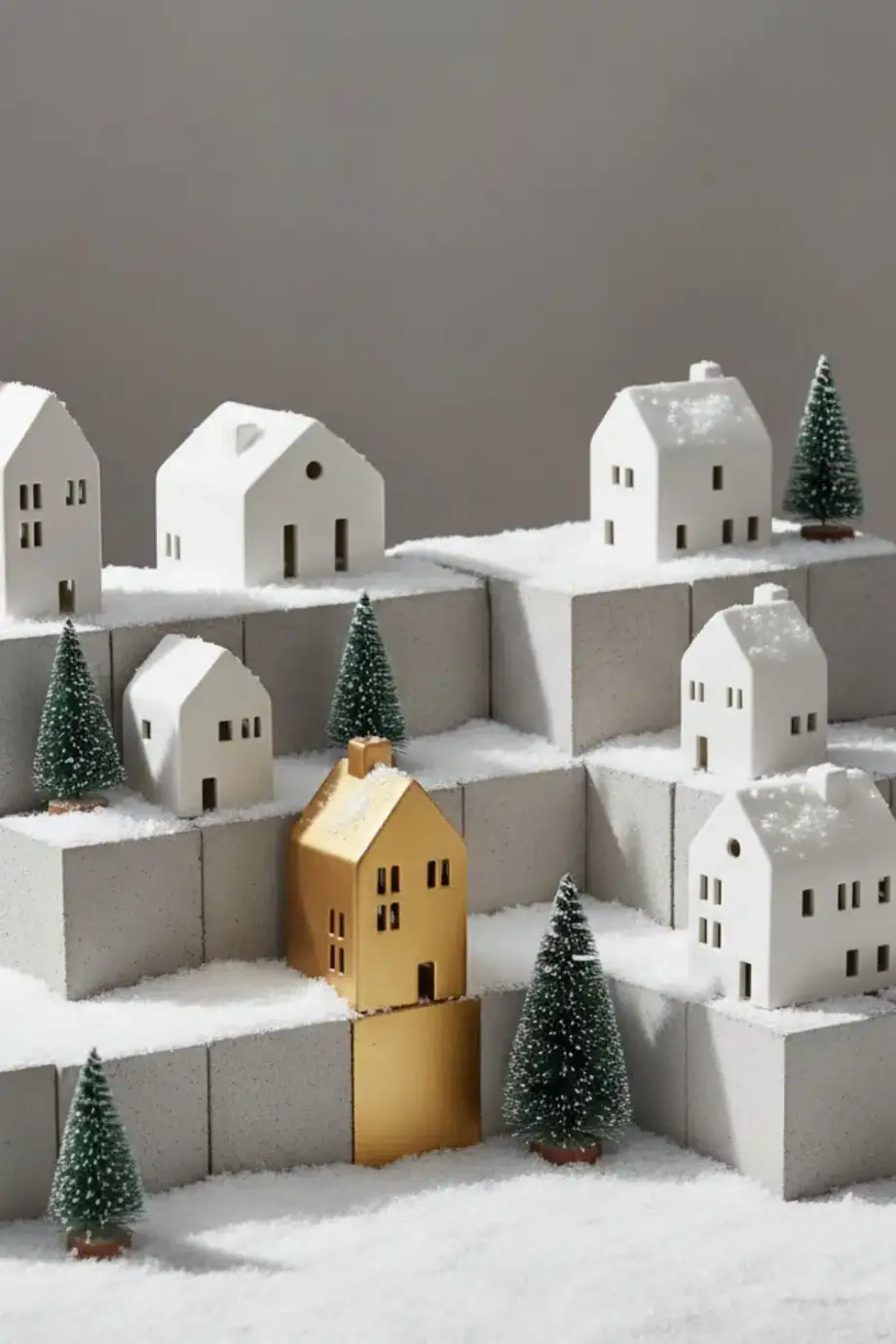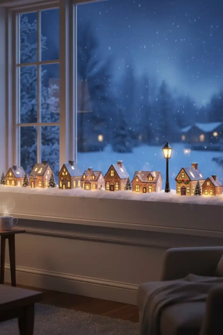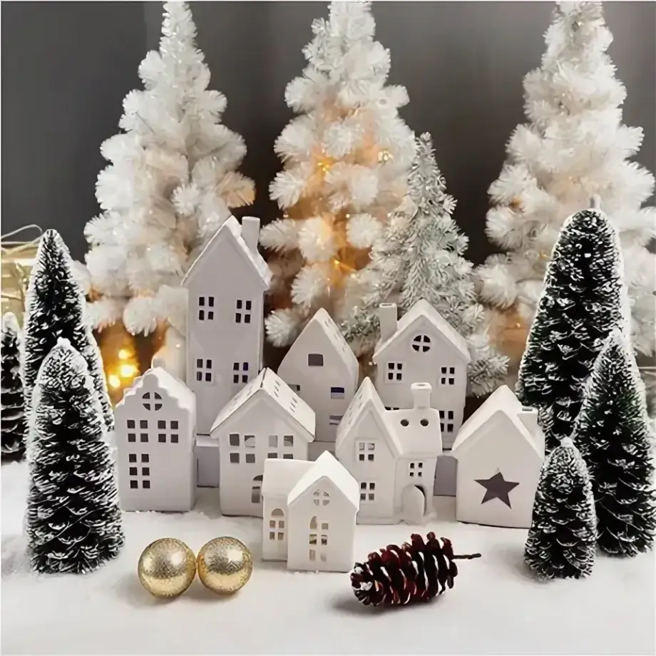 Γύρω μπορείς να βάλεις γούνινα μαξιλάρια ή ένα χοντρό ριχτάρι, ώστε να δείχνει σαν χιονισμένη γωνιά χαλάρωσης. Κράτα το φόντο σε μπεζ, κρεμ ή απαλό γκρι, για να ξεχωρίζει το χωριό και να μη χάνεται μέσα στα χρώματα.